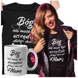 Koszulka dla Mamy na Dzień Mamy zestaw z kubkiem Bóg nie może być wszędzie dlatego stworzył Mamę koszulka czarna