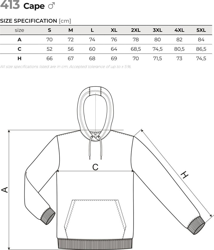 Męska bluza Cape 413 to solidny model o wysokiej gramaturze 320 g/m², wykonany z miękkiej dzianiny typu Terry (65% bawełna, 35% poliester). Czesana strona wewnętrzna zapewnia wyjątkowy komfort cieplny oraz miękkość, co sprawia, że bluza doskonale chroni przed chłodem. Prosty krój ze szwami bocznymi gwarantuje swobodę ruchów, a kaptur z podszewką, regulowany za pomocą sznurka, oraz praktyczna kieszeń typu kangurka nadają jej sportowy charakter. Dolny ściągacz i mankiety rękawów wykonane z dzianiny 2:2 z dodatkiem 5% elastanu zapewniają trwałość i idealne dopasowanie. Wewnętrzna część lamówki na karku została wzmocniona kolorową taśmą, a tkana metka podkreśla wysoką jakość wykonania, czyniąc produkt doskonałą bazą pod haft, sitodruk czy transfer.