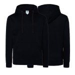 Model posiada kaptur ze sznurkami w kolorze bluzy, który chroni przed wiatrem i chłodem, oraz naszytą kieszeń typu kangur, idealną do ogrzania rąk lub przechowywania drobiazgów. Elastyczne ściągacze 2x1 przy rękawach i u dołu bluzy zapewniają idealne dopasowanie, a łatwo usuwalna metka ułatwia personalizację — bluza świetnie sprawdzi się jako element odzieży firmowej lub reklamowej.