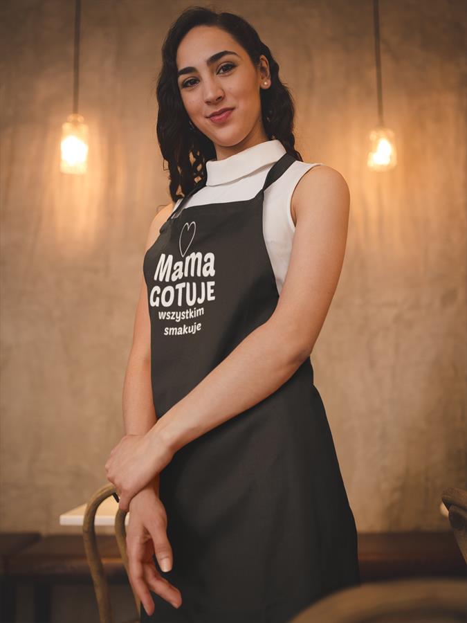 Wyjątkowy fartuch z napisem "Mama gotuje wszystkim smakuje".