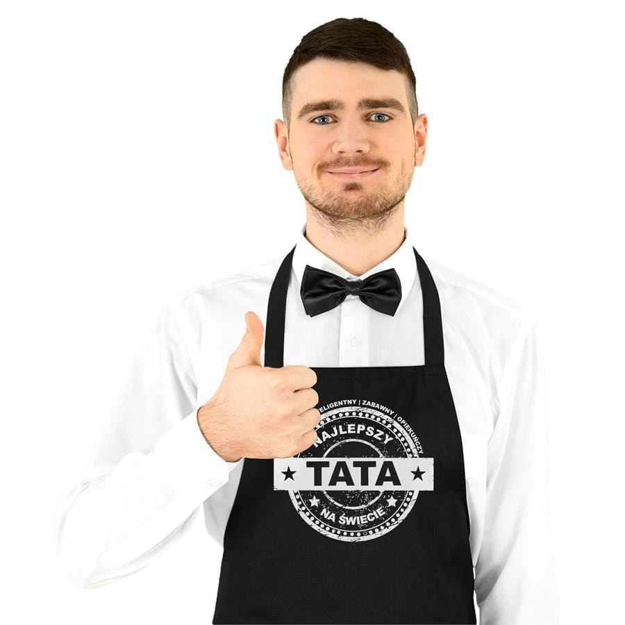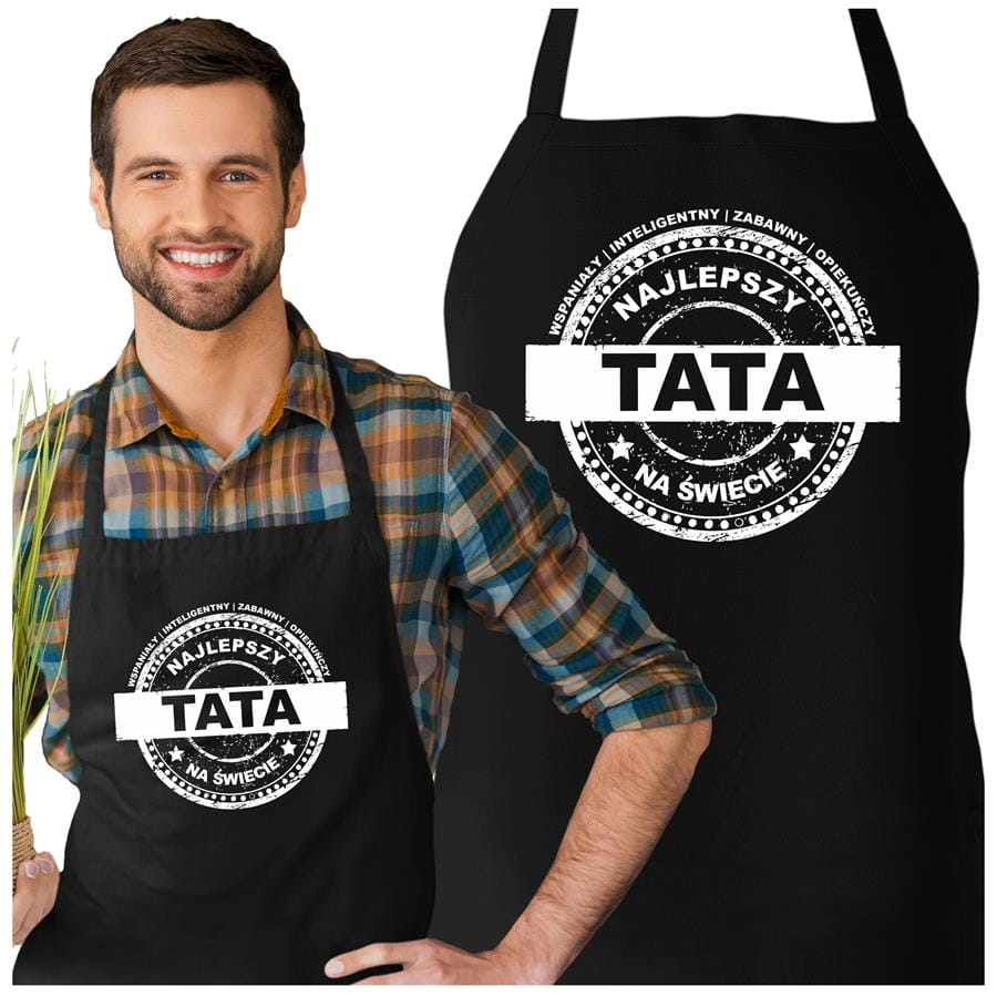 Wyjątkowy fartuch dla taty z napisem: "WSPANIAŁY | INTELIGENTNY | ZABAWNY | OPIEKUŃCZY Najlepszy Tata na świecie".