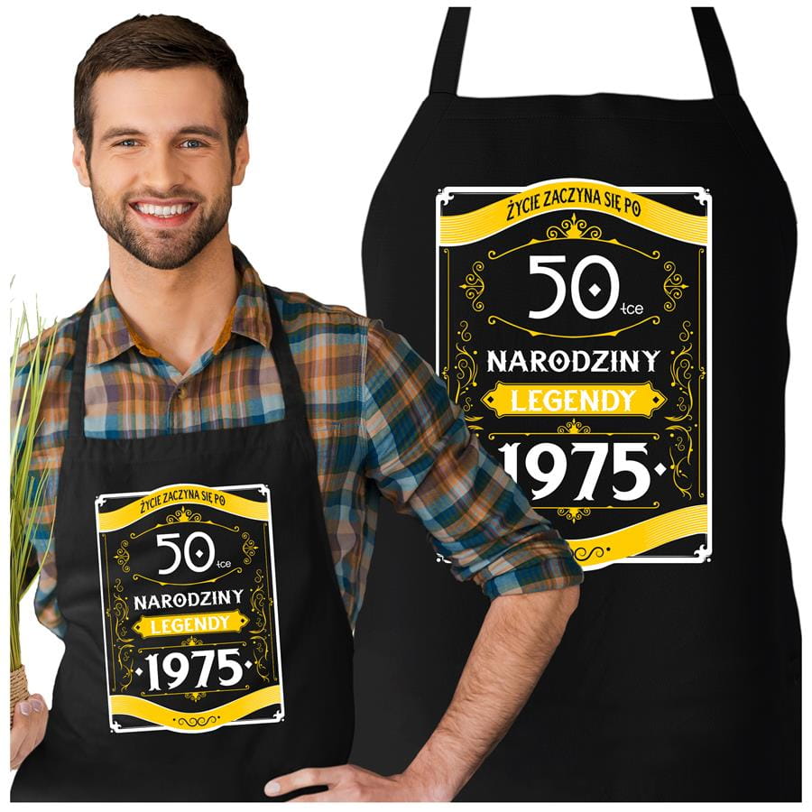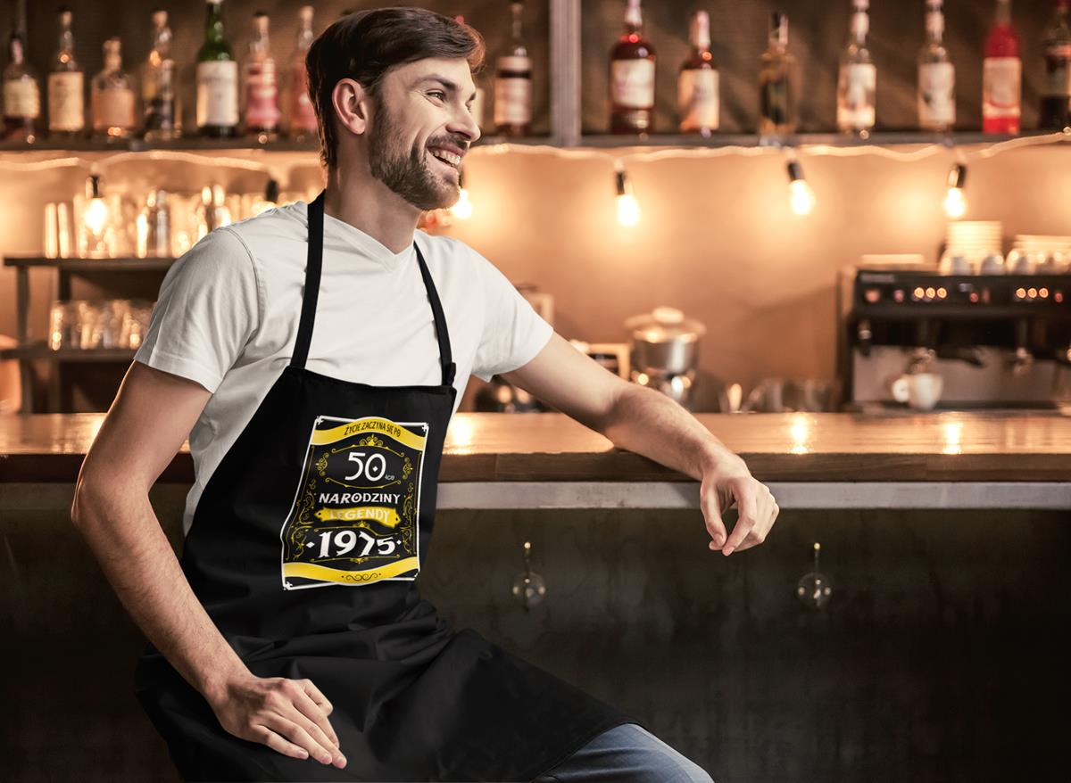 Fartuch na 60 urodziny prezent urodzinowy z napisem: "ŻYCIE ZACZYNA SIĘ PO 60-TCE NARODZINY LEGENDY 1965"