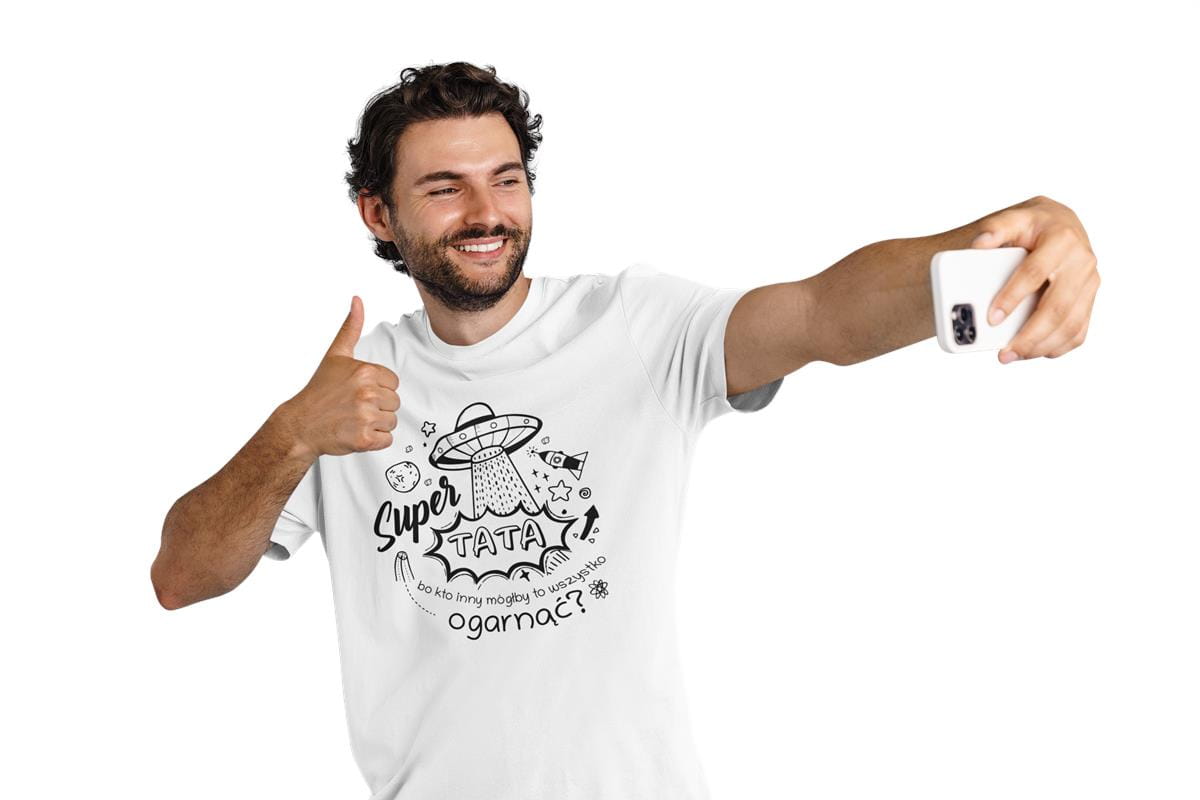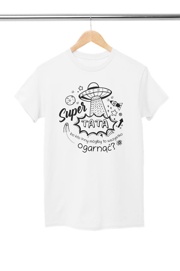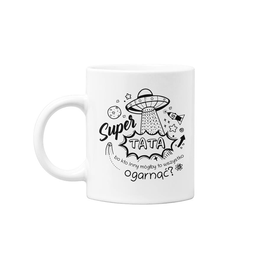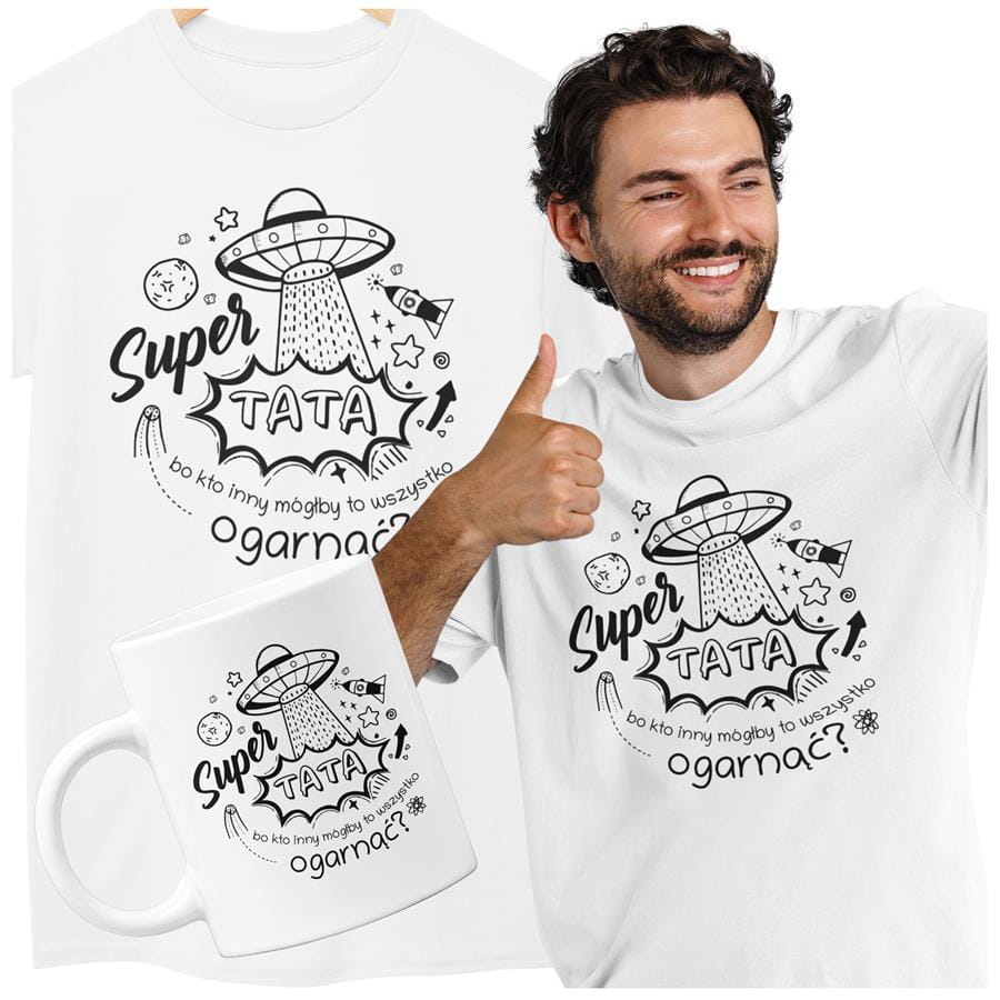 KOSZULKA DLA TATY NA PREZENT NA URODZINY NA DZIEŃ OJCA Kubek dla Taty prezent na Dzień Ojca kubek z napisem "Super TATA bo kto inny mógłby to wszystko ogarnąć?" kolor biały