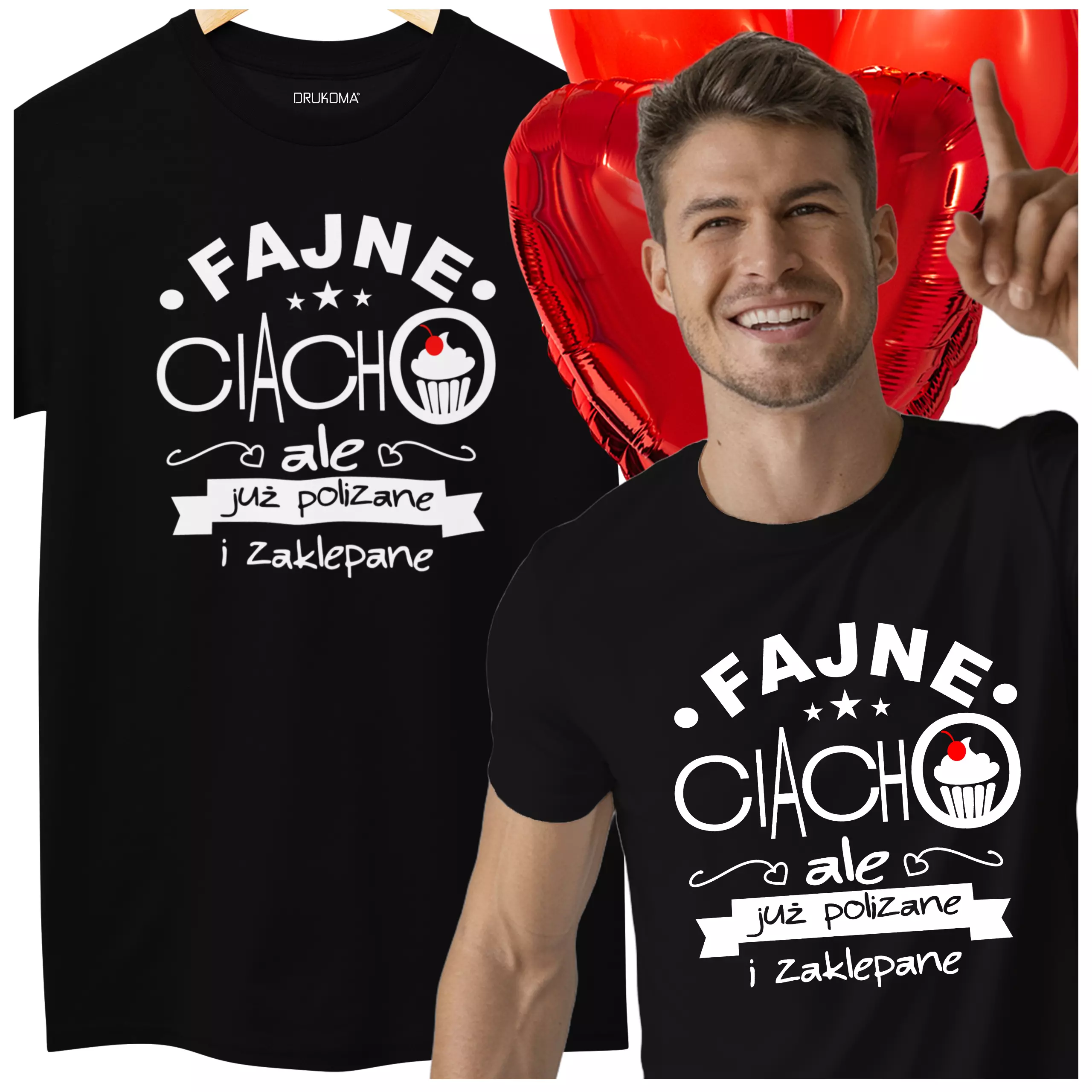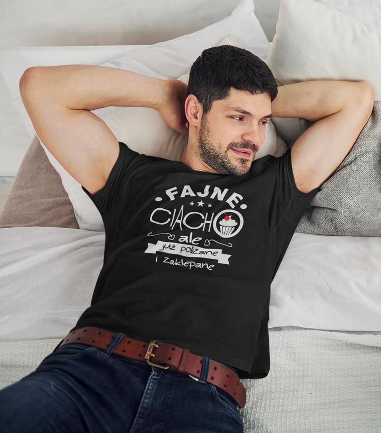 KOSZULKA NA DZIEŃ CHŁOPAKA PREZENT DLA CHŁOPAKA Z NAPISEM: "FAJNE CIACHO, ALE JUŻPOLIZANE I ZAKLEPANE" KOLOR CZARNY