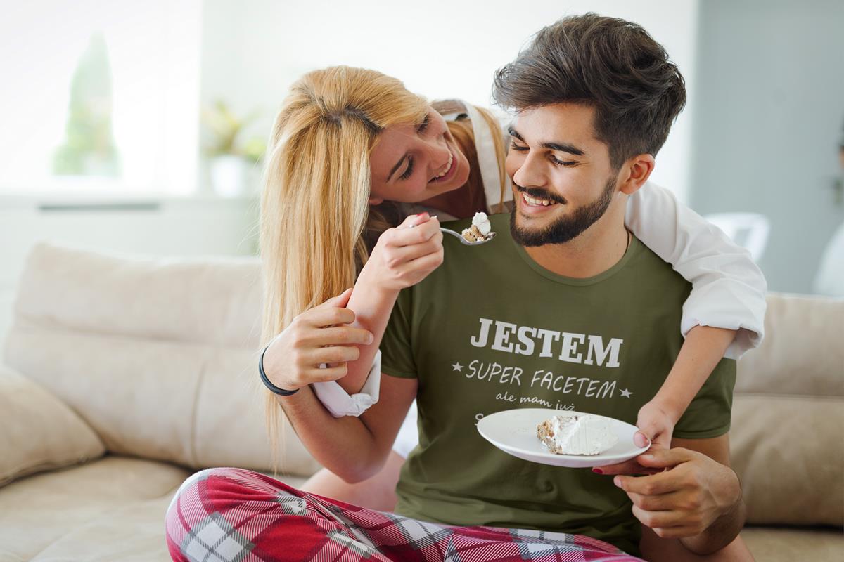 KOSZULKA NA WALENTYNKI PREZENT DLA CHŁOPAKA JESTEM SUPER FACETEM ALE MAM JUŻ SUPER KOBIETĘ KOLOR KHAKI