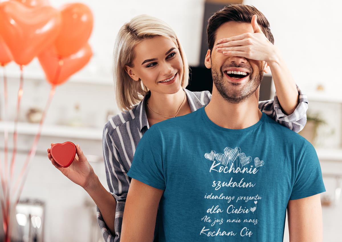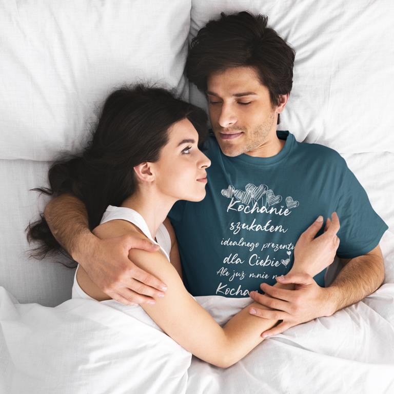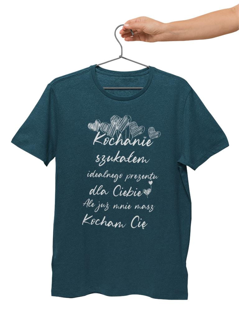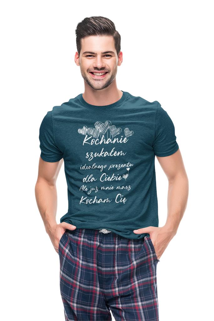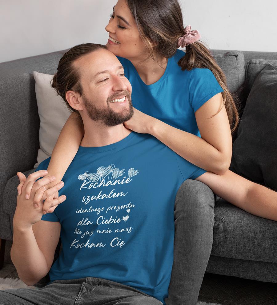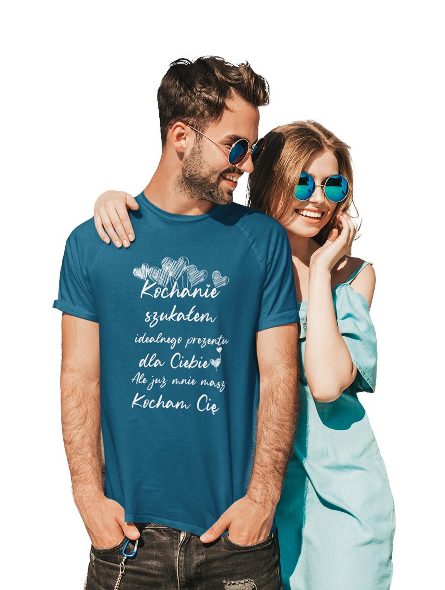 KOSZULKA NA WALENTYNKI PREZENT DLA CHŁOPAKA KOCHANIE SZUKAŁEM IDEALNEGO PREZENTU DLA CIEBIE, ALE JUŻ MNIE MASZ KOCHAM CIĘ KOLOR PETROL BLUE