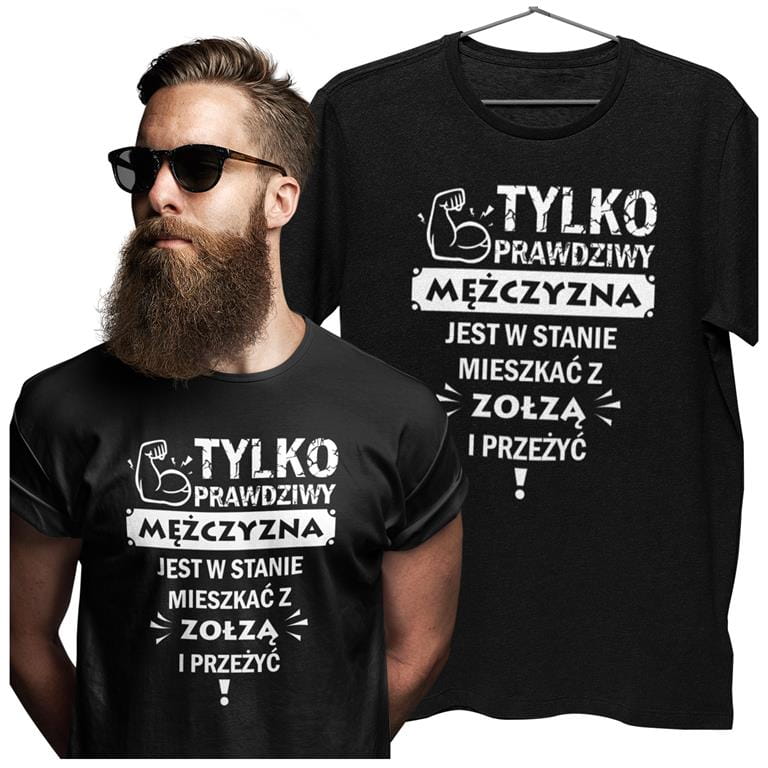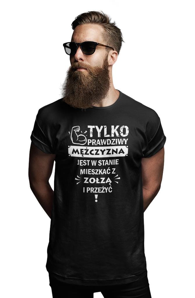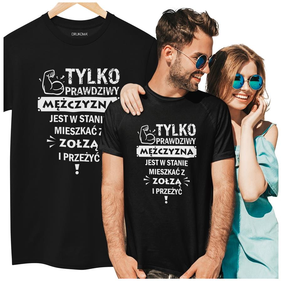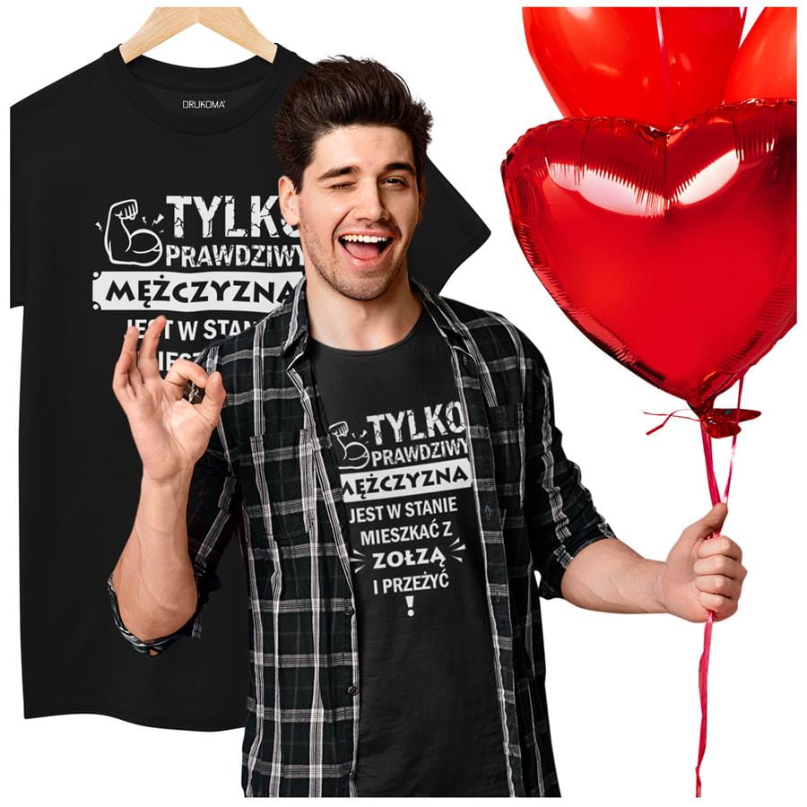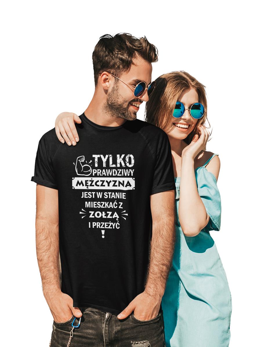 "Tylko prawdziwy mężczyzna jest w stanie mieszkać z zołzą i przeżyć!" – ta koszulka to nie tylko styl, ale i humor, który podkreśli wyjątkowość obdarowywanej osoby.