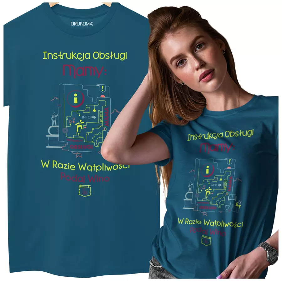 KOSZULKA Z KUBKIEM dla Mamy Z KOLOROWYM NADRUKIEM na Dzień Matki: "Instrukcja Mamy... w razie wątpliwości podaj wino" kolor PETROL