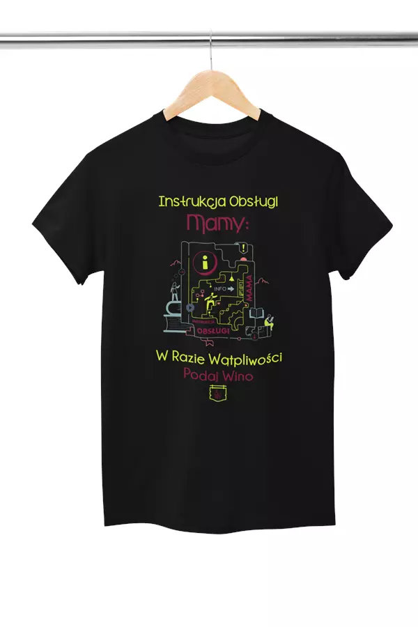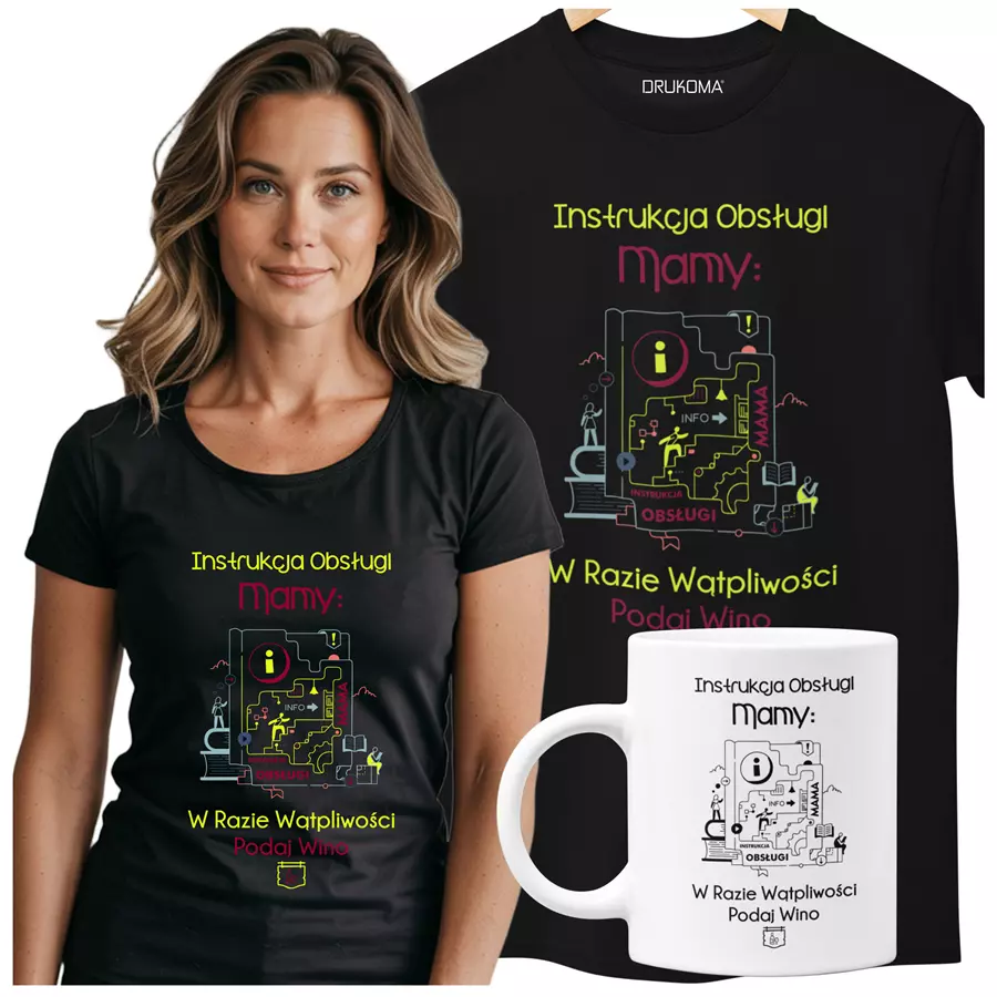 KOSZULKA Z KUBKIEM dla Mamy Z KOLOROWYM NADRUKIEM na Dzień Matki: "Instrukcja Mamy... w razie wątpliwości podaj wino" kolor czarny