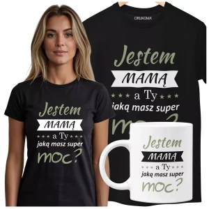 KOSZULKA Z KUBKIEM dla Mamy na Dzień Matki z kolorowym nadrukiem: "Jestem mamą, a ty jaką masz super moc?" kolor czarny
