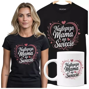 KOSZULKA Z KUBKIEM dla Mamy na Dzień Matki z kolorowym nadrukiem: "Najlepsza Mama na Świecie" kolor czarny