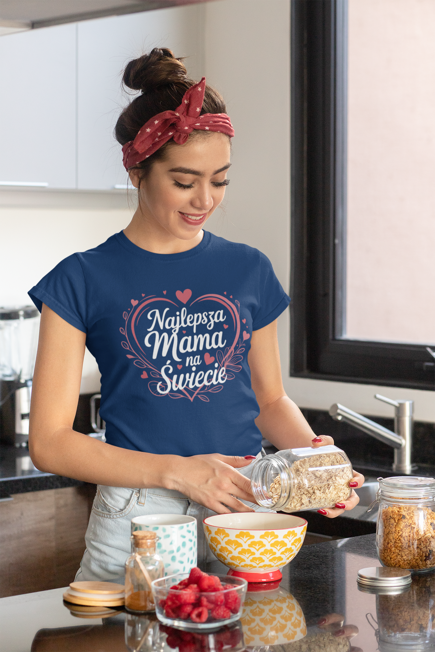 KOSZULKA Z KUBKIEM dla Mamy na Dzień Matki z kolorowym nadrukiem: "Najlepsza Mama na Świecie" kolor granatowy