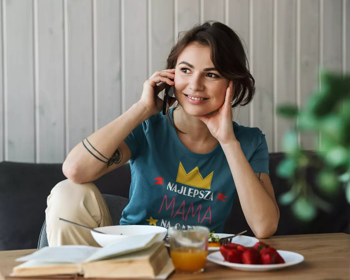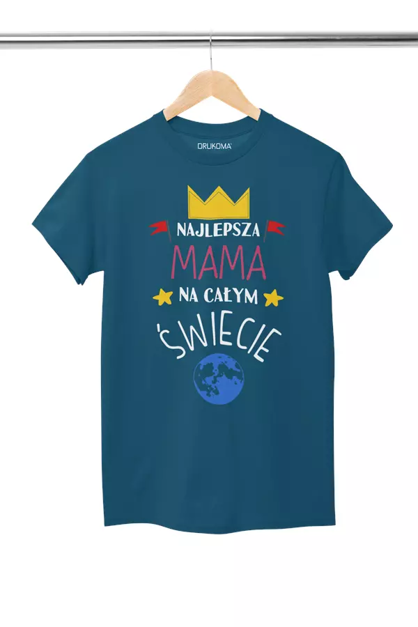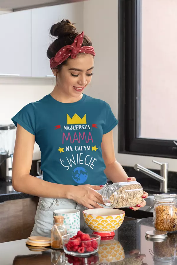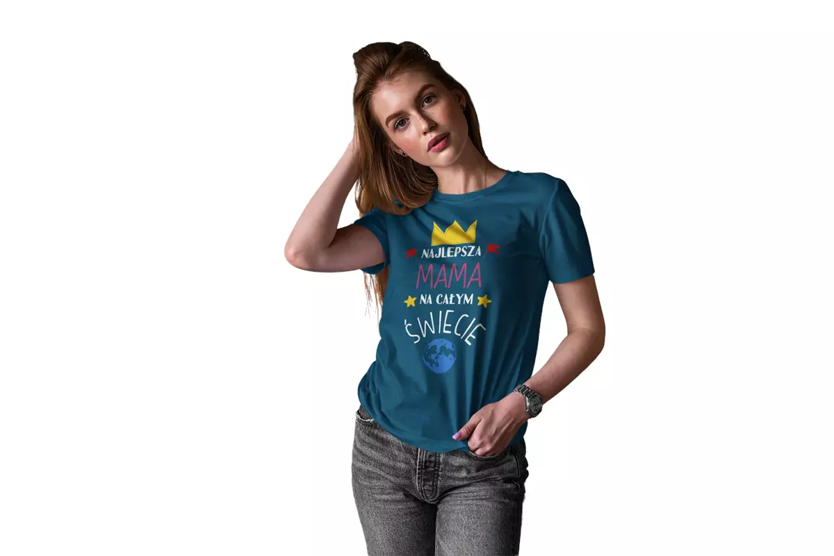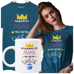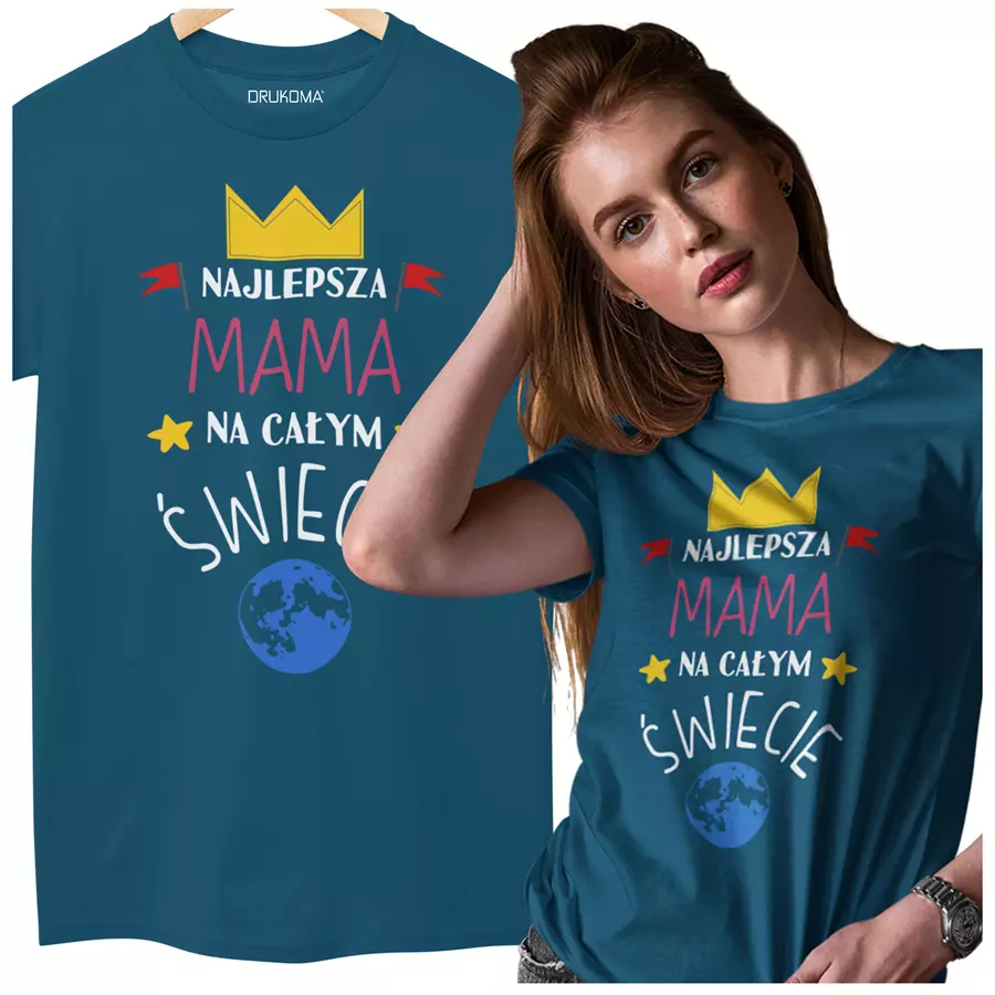 KOSZULKA Z KUBKIEM dla Mamy na Dzień Matki z kolorowym nadrukiem: "Najlepsza mama na całym świecie" kolor petrol