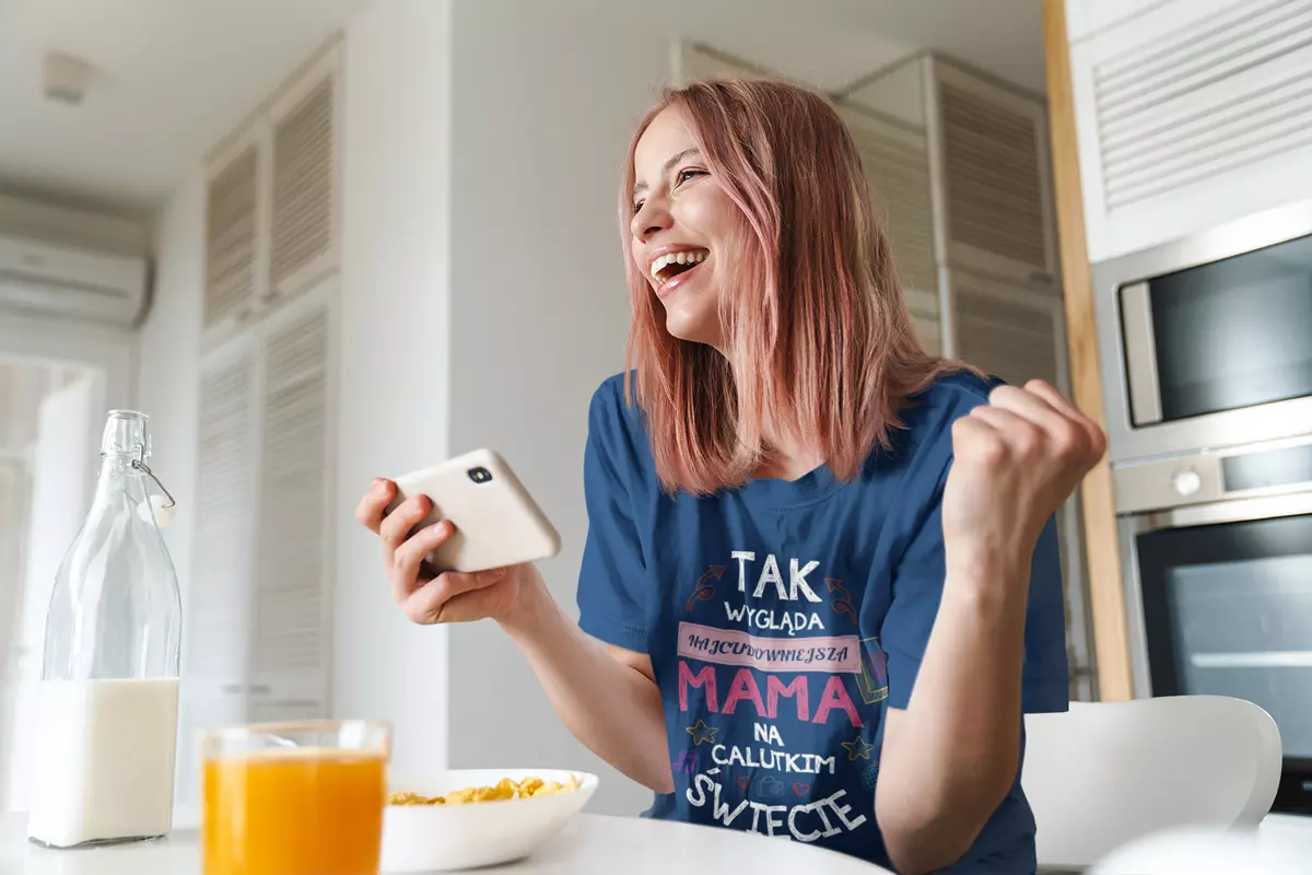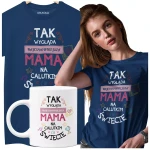 KOSZULKA Z KUBKIEM dla Mamy na Dzień Matki z kolorowym nadrukiem: "Tak wygląda najcudowniejsza mama na calutkim świecie" kolor granatowy