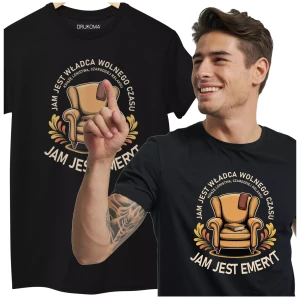KOSZULKA ZABAWNA NA KAŻDĄ OKAZJE Z NAPISEM: "JAM JEST WŁADCA WOLNEGO CZASU KSIĄŻĘ LENISTWA, CZARODZIEJ RELAKSU JAM JEST EMERYT"