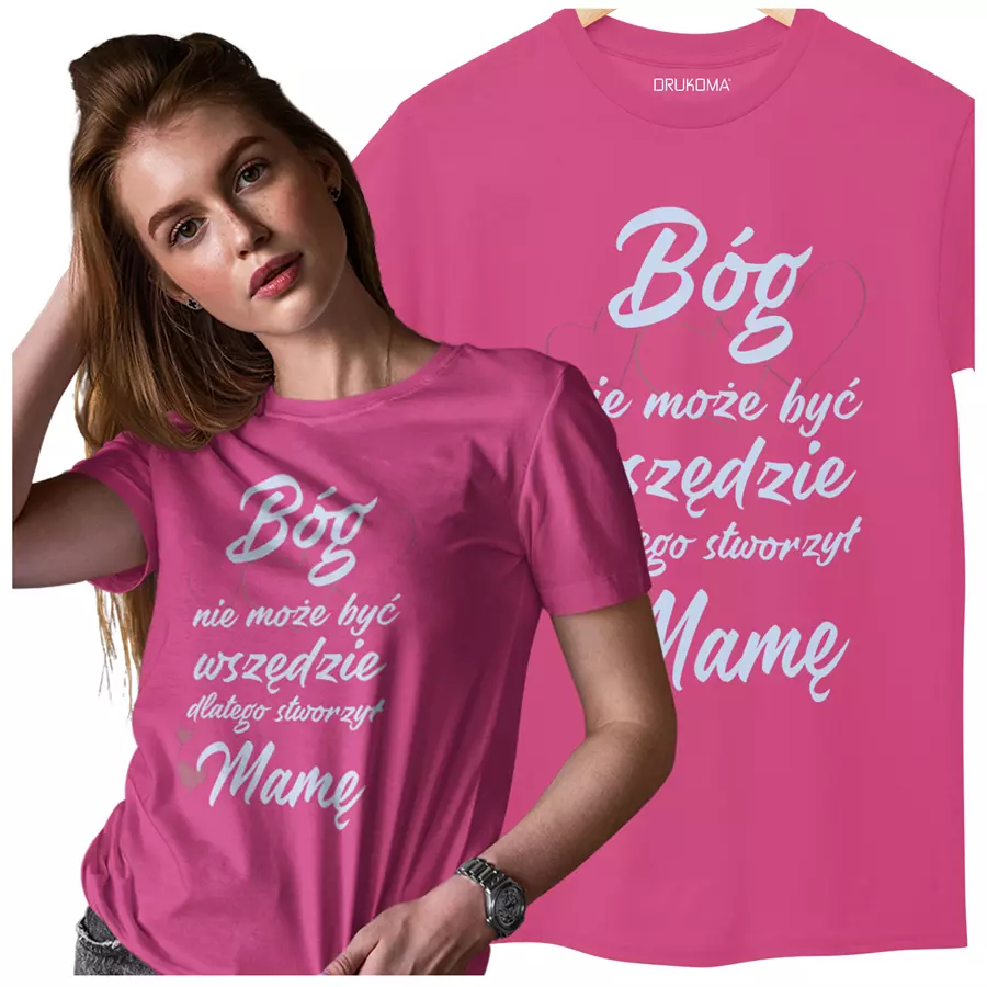 KOSZULKA dla Mamy Z KOLOROWYM NADRUKIEM na Dzień Matki: "Bóg nie może być wszędzie, dlatego stworzył Mamę" kolor różowy