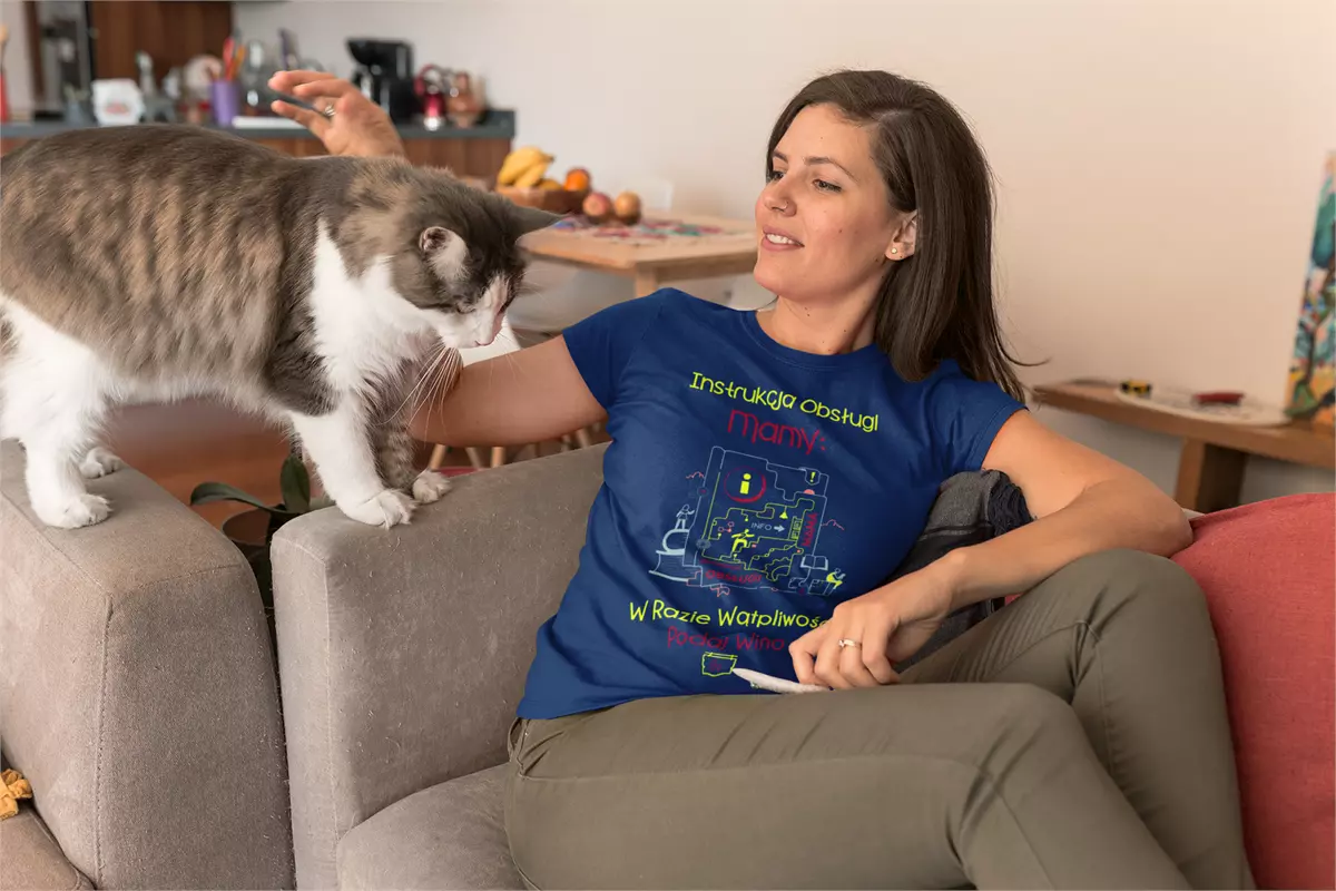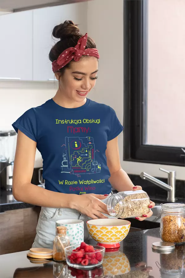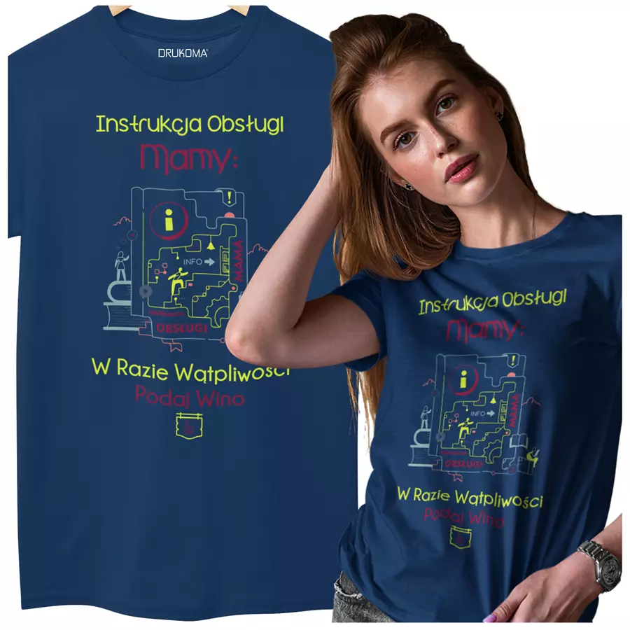 KOSZULKA dla Mamy Z KOLOROWYM NADRUKIEM na Dzień Matki: "Instrukcja Mamy... w razie wątpliwości podaj wino" kolor granatowy