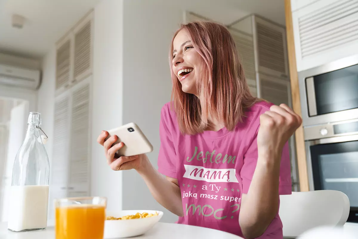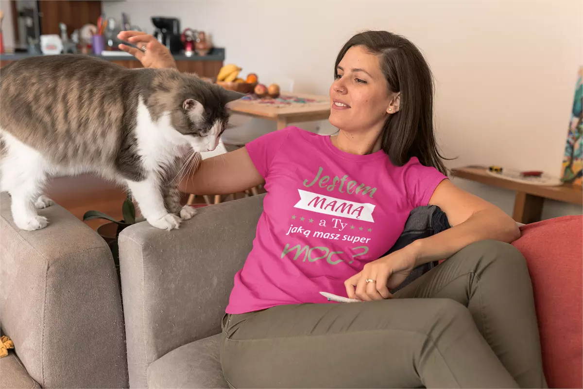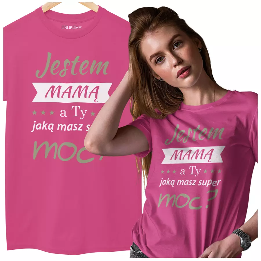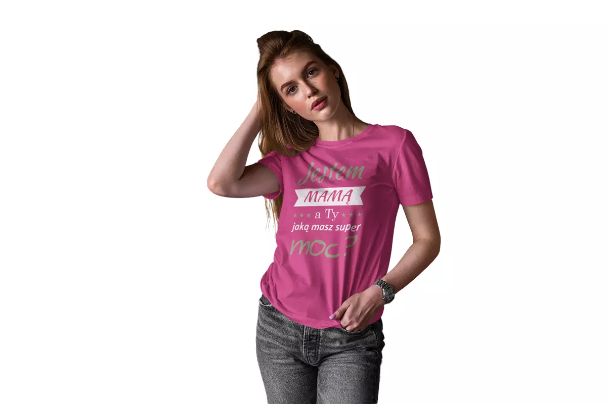 KOSZULKA dla Mamy Z KOLOROWYM NADRUKIEM na Dzień Matki: "Jestem mamą, a ty jaką masz super moc?" kolor różowy