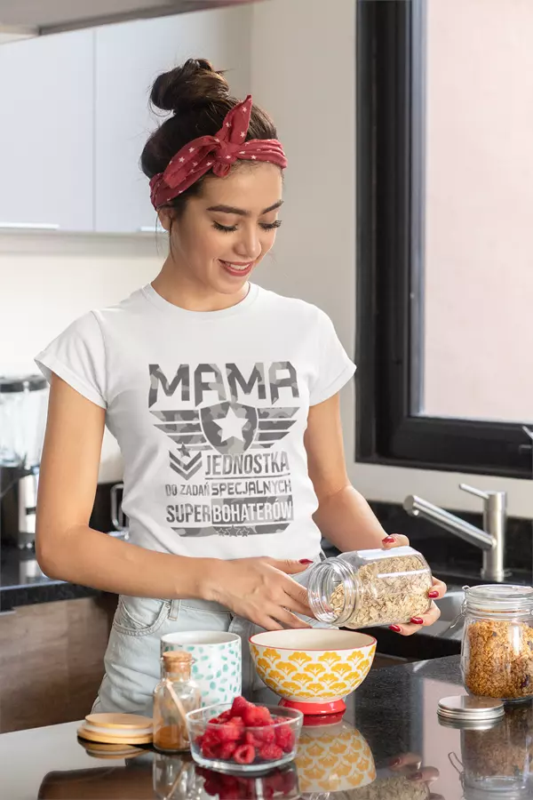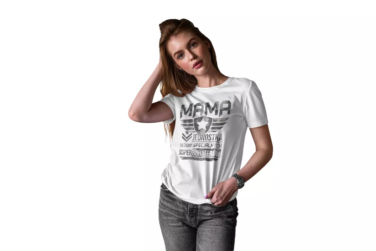 KOSZULKA dla Mamy Z KOLOROWYM NADRUKIEM na Dzień Matki: "MAMA jednostka do zadań specjalnych super bohaterów" kolor biały