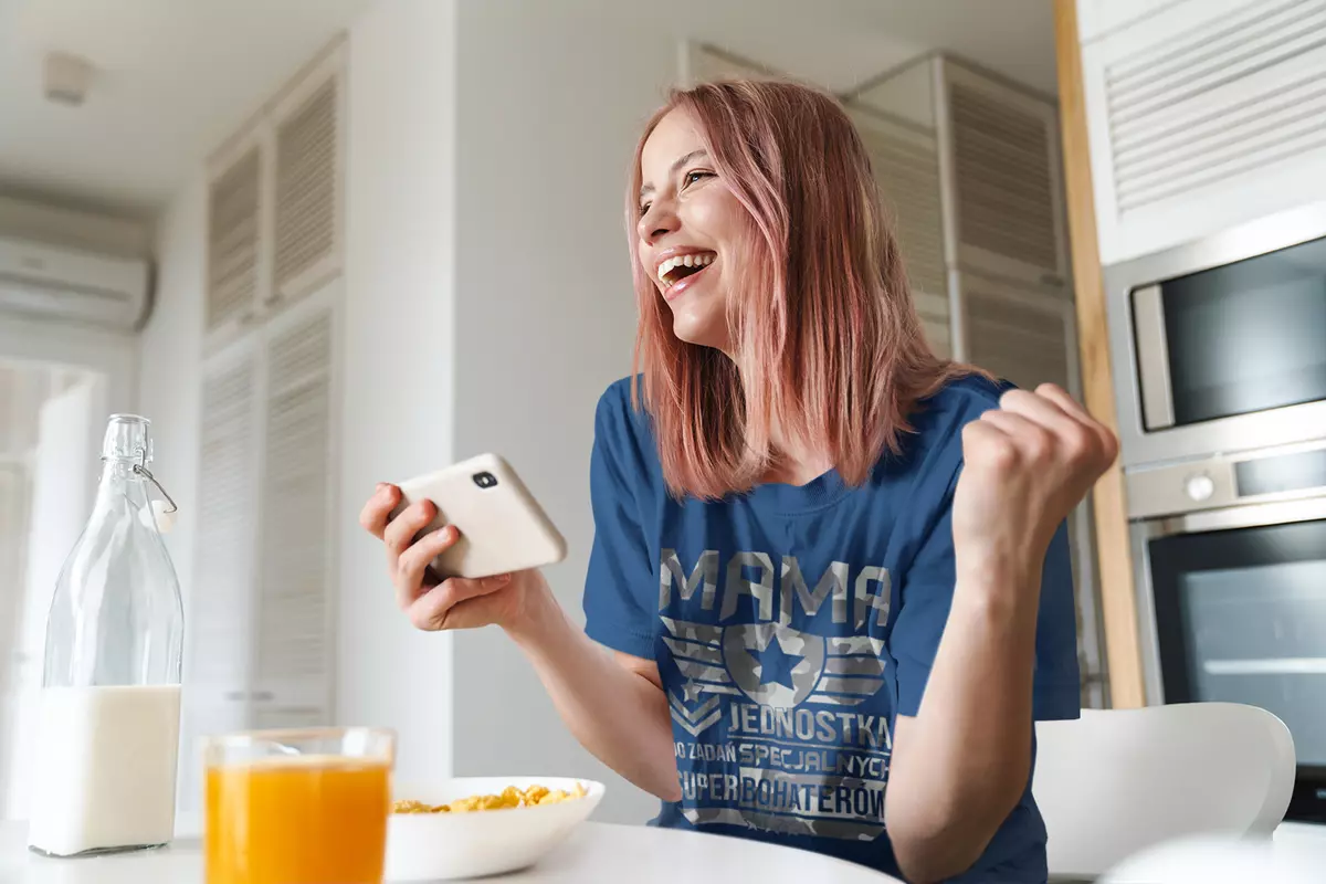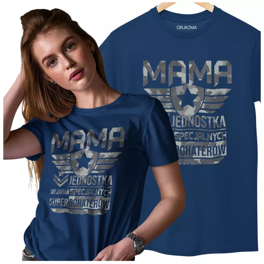 KOSZULKA dla Mamy Z KOLOROWYM NADRUKIEM na Dzień Matki: "MAMA jednostka do zadań specjalnych super bohaterów" kolor granatowy