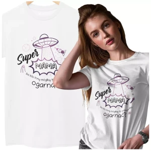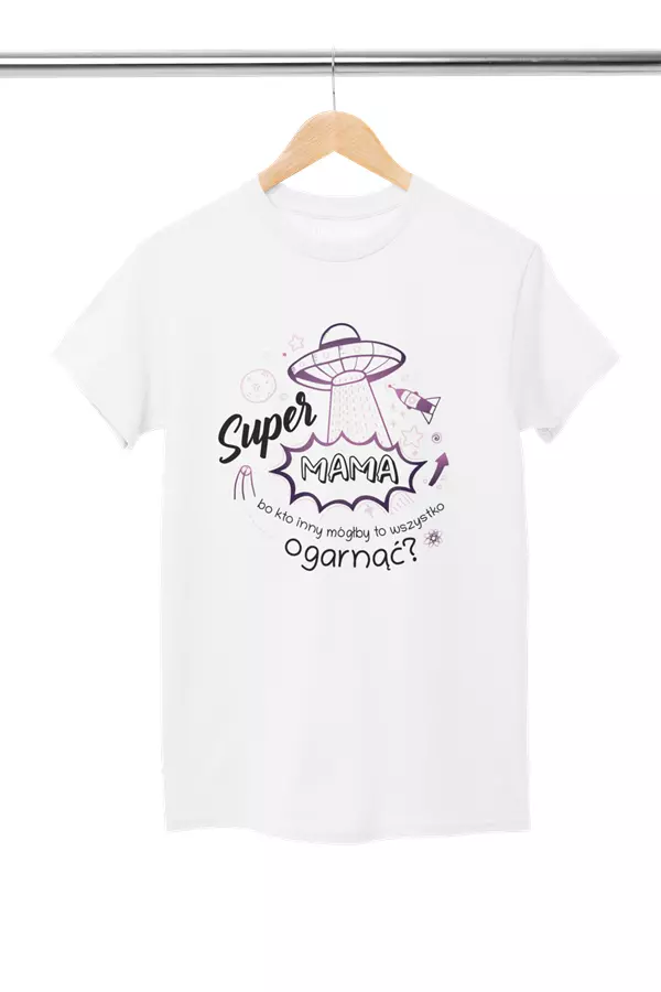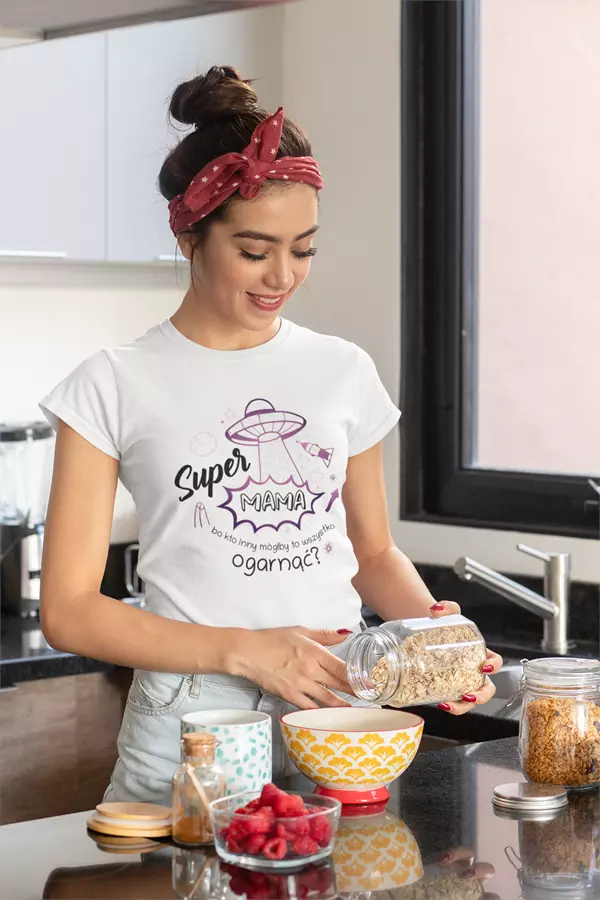 Koszulka z napisem: "Super MAMA bo kto inny mógłby to wszystko ogarnąć?".
