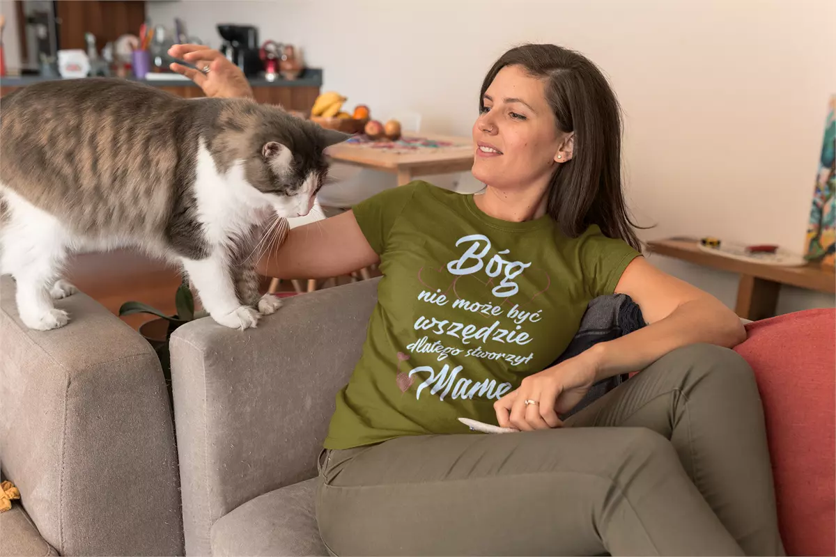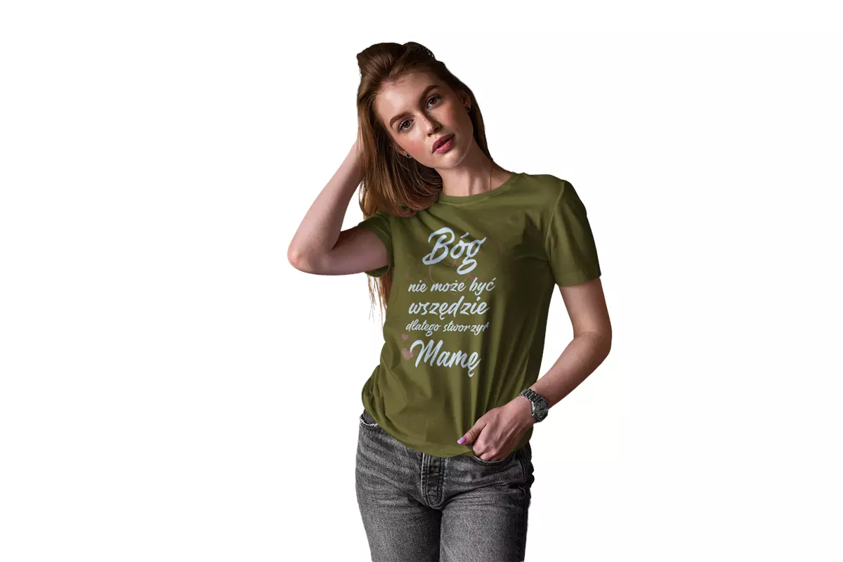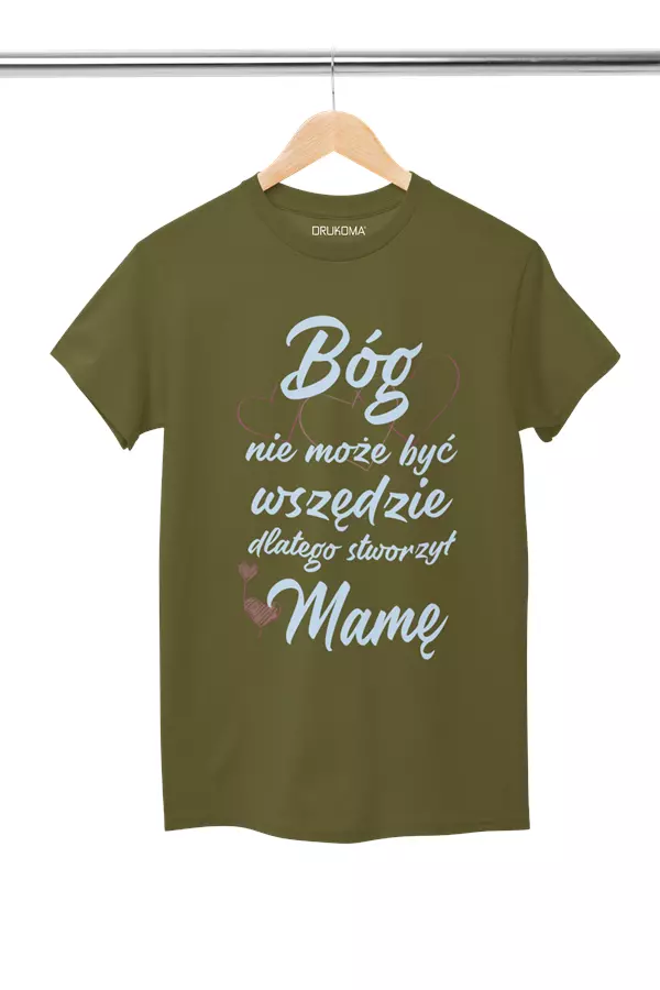 KOSZULKA z kubkiem dla Mamy Z KOLOROWYM NADRUKIEM na Dzień Matki: "Bóg nie może być wszędzie, dlatego stworzył Mamę" kolor khaki