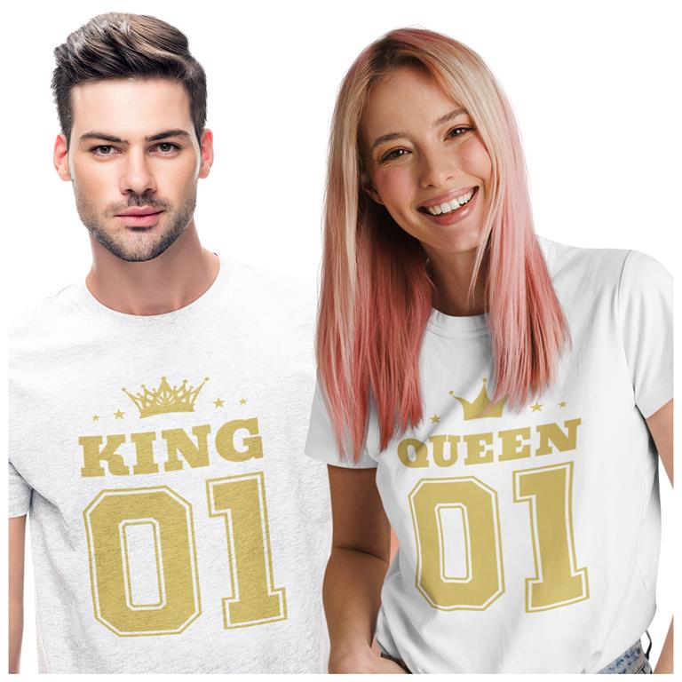 Koszulki "King & Queen 01" ze złotym nadrukiem – idealny prezent na Walentynki! Odkryj nasze specjalne zestawy dla par, dostępne w limitowanej edycji. Każdy zestaw zawiera: