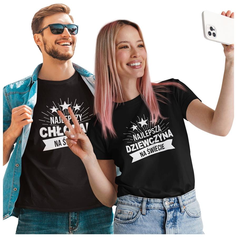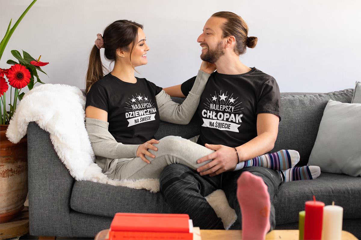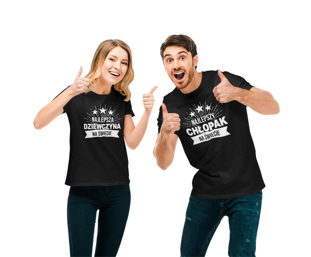 Koszulki "Najlepszy Chłopak & Najlepsza Dziewczyna na świecie" z białym nadrukiem – idealny prezent na Walentynki! Odkryj nasze specjalne zestawy dla par, dostępne w limitowanej edycji. Każdy zestaw zawiera: