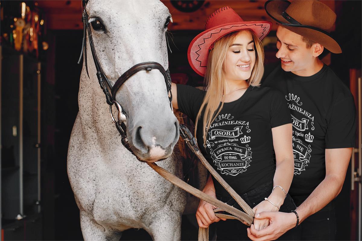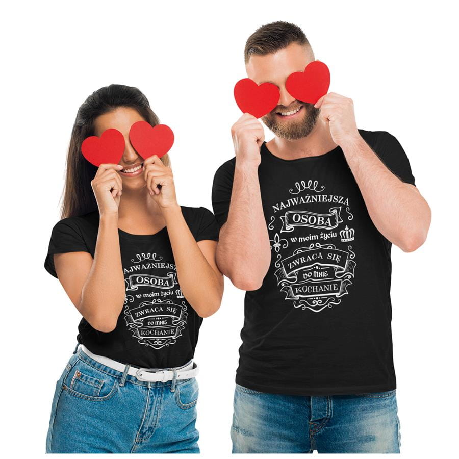 Koszulki "Najważniejsza osoba zwraca się do mnie kochanie" z białym nadrukiem – idealny prezent na Walentynki! Odkryj nasze specjalne zestawy dla par, dostępne w limitowanej edycji. Każdy zestaw zawiera:
