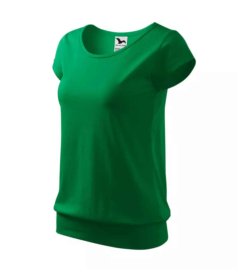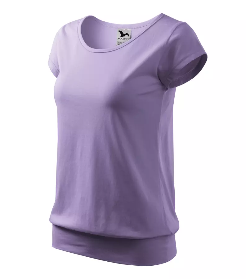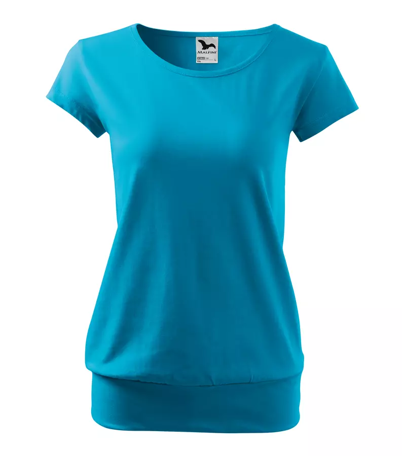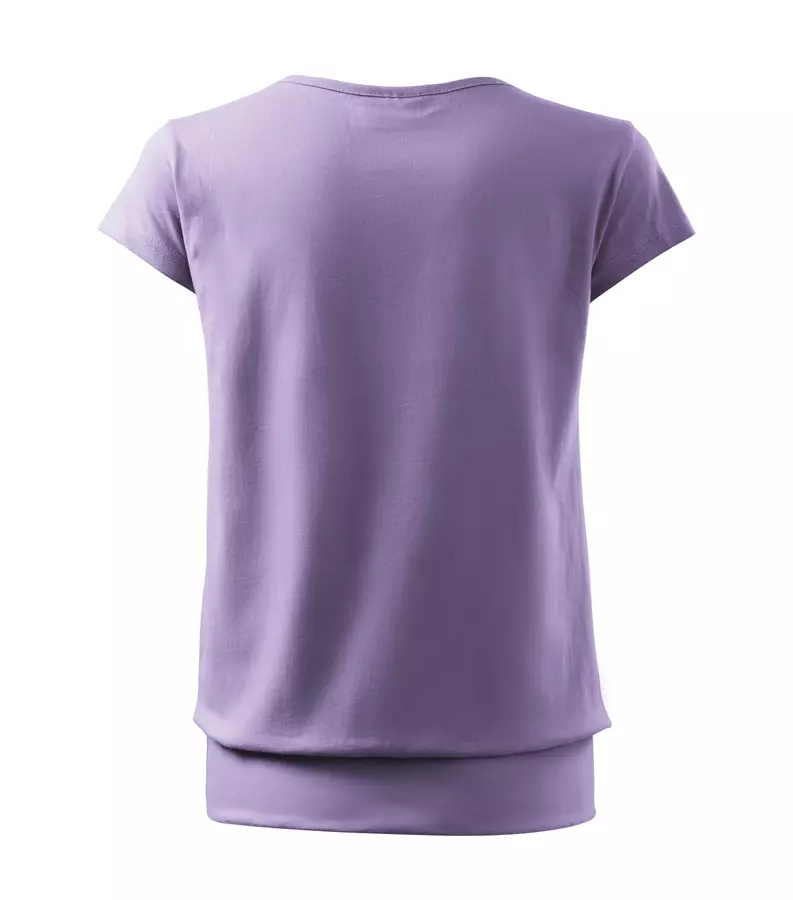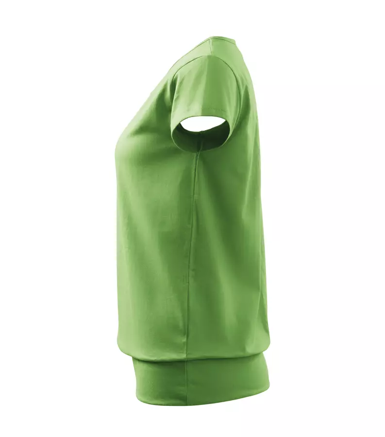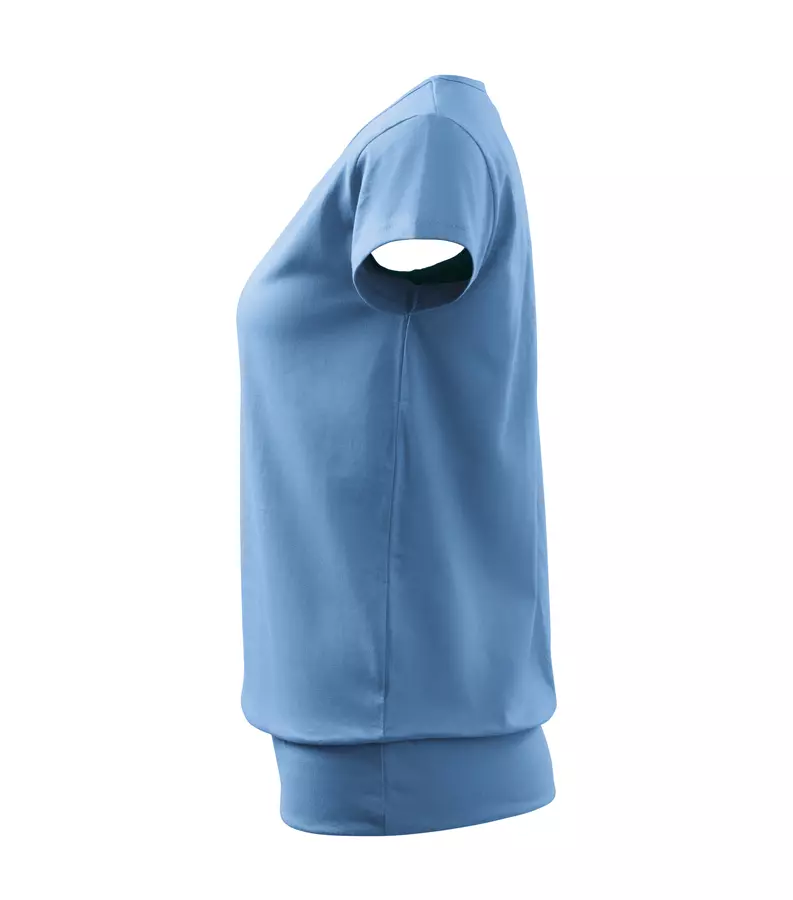 Koszulka damska City 120 to stylowy T-shirt o gramaturze 150 g/m², wykonany w 100% z bawełny (Single Jersey) z wykończeniem silikonowym, które zapewnia wyjątkową gładkość i miękkość materiału. Model charakteryzuje się luźnym krojem ze szwami bocznymi, bardzo krótkimi rękawami oraz szerokim obszyciem dolnej części, co nadaje mu nowoczesny wygląd. Posiada dekolt wykończony materiałem wierzchnim, szew wzmacniający na ramionach oraz satynową metkę, dzięki czemu idealnie nadaje się pod znakowanie: druk cyfrowy, sitodruk, transfer oraz lithotransfer.