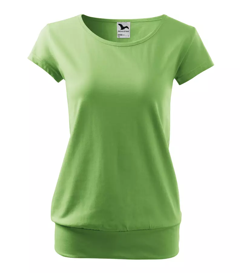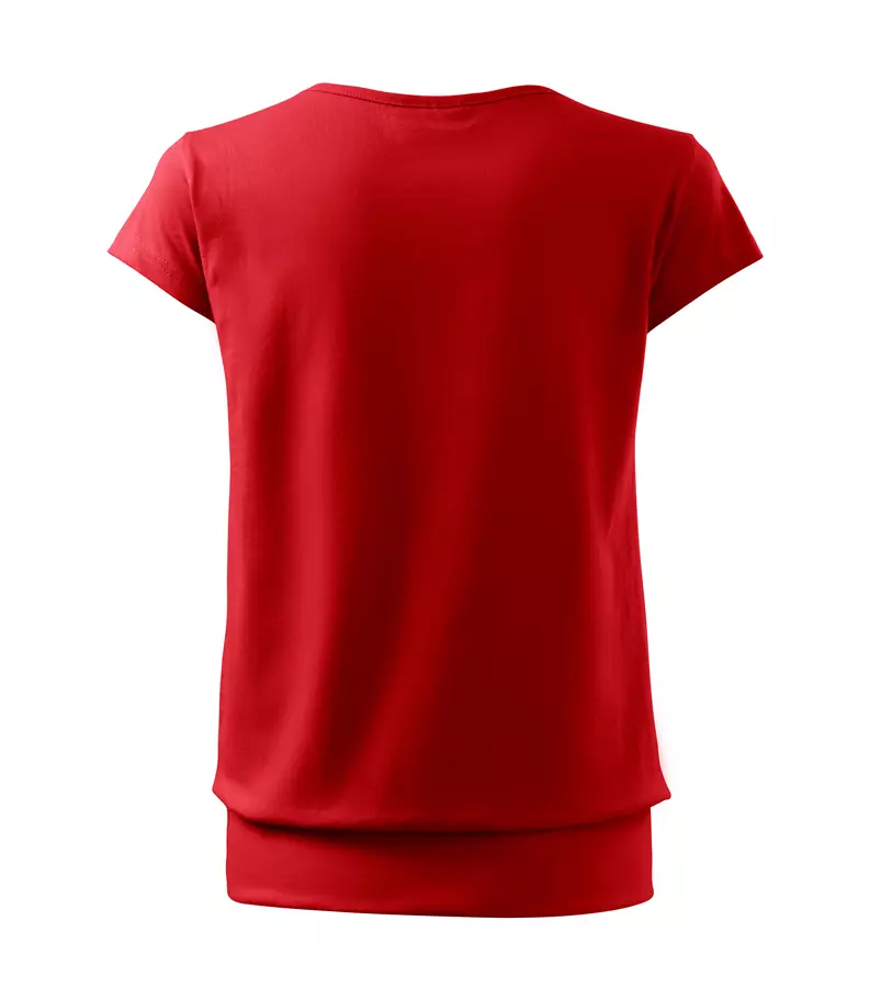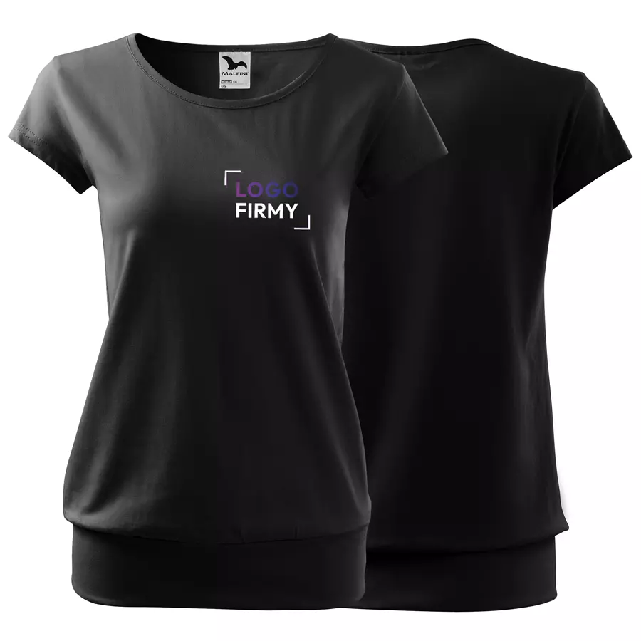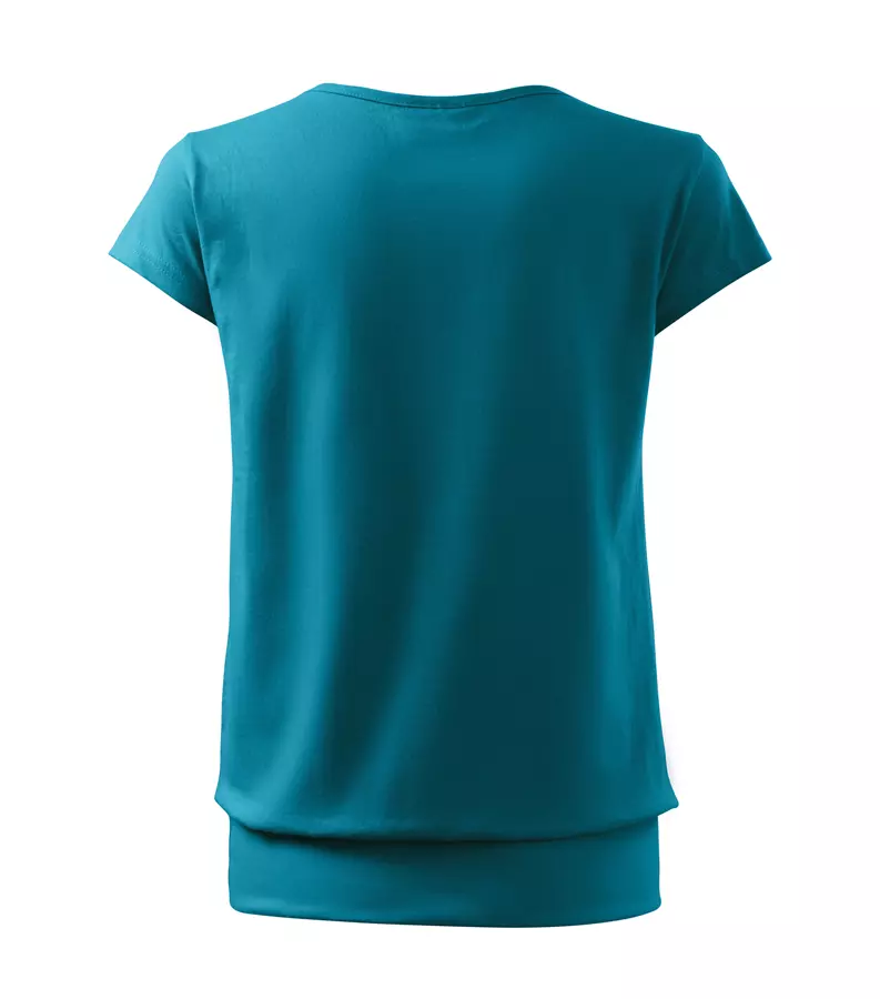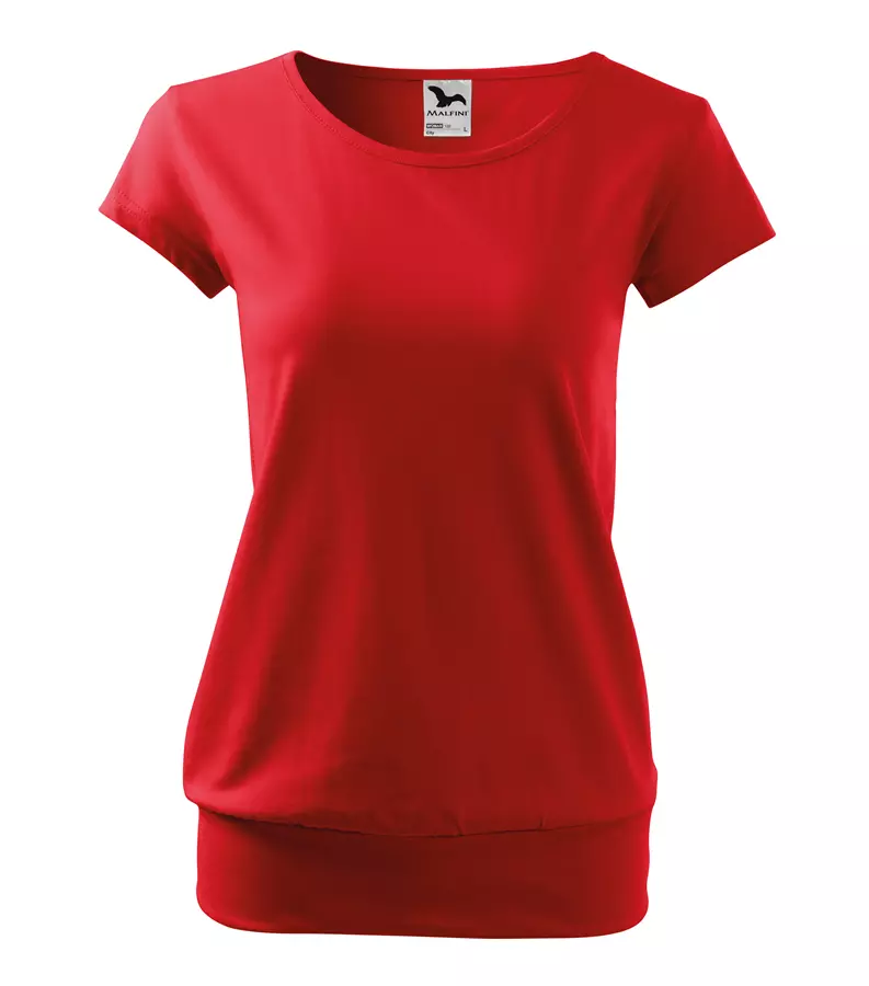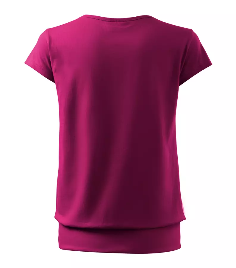 Koszulka damska City 120 to stylowy T-shirt o gramaturze 150 g/m², wykonany w 100% z bawełny (Single Jersey) z wykończeniem silikonowym, które zapewnia wyjątkową gładkość i miękkość materiału. Model charakteryzuje się luźnym krojem ze szwami bocznymi, bardzo krótkimi rękawami oraz szerokim obszyciem dolnej części, co nadaje mu nowoczesny wygląd. Posiada dekolt wykończony materiałem wierzchnim, szew wzmacniający na ramionach oraz satynową metkę, dzięki czemu idealnie nadaje się pod znakowanie: druk cyfrowy, sitodruk, transfer oraz lithotransfer.
