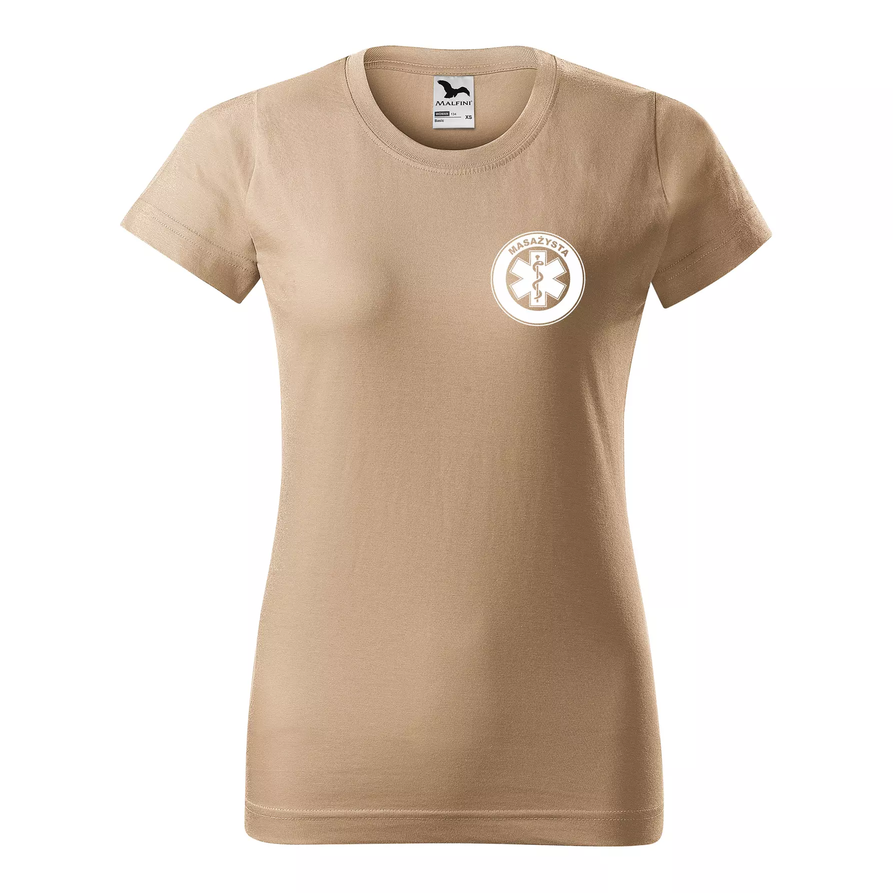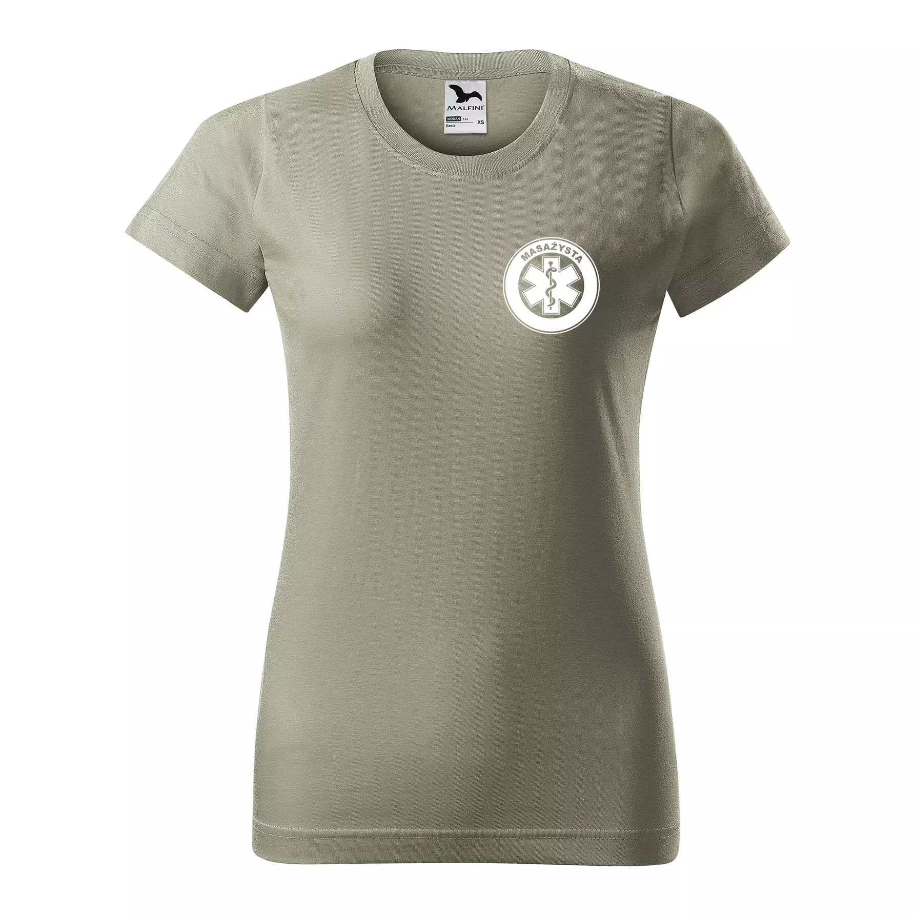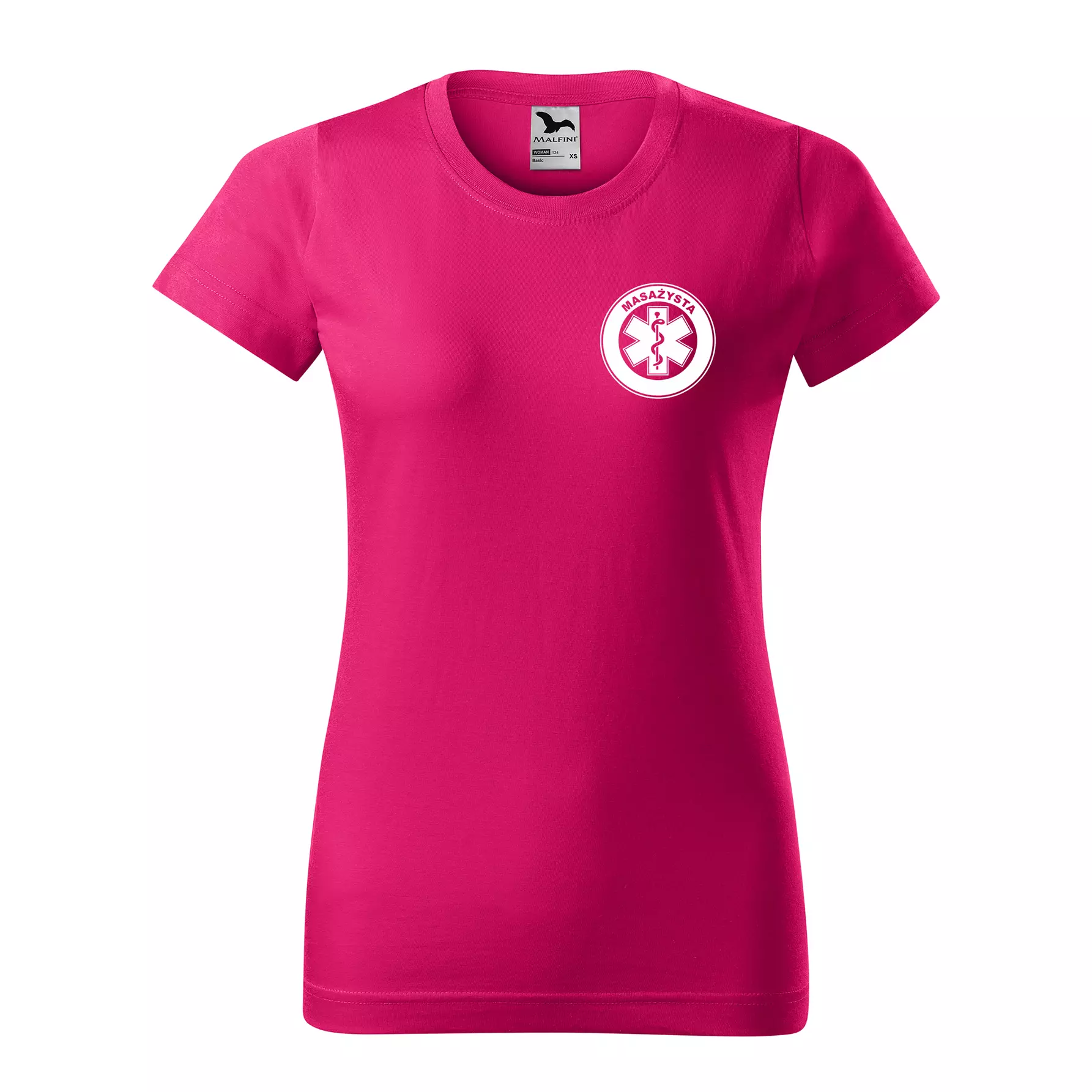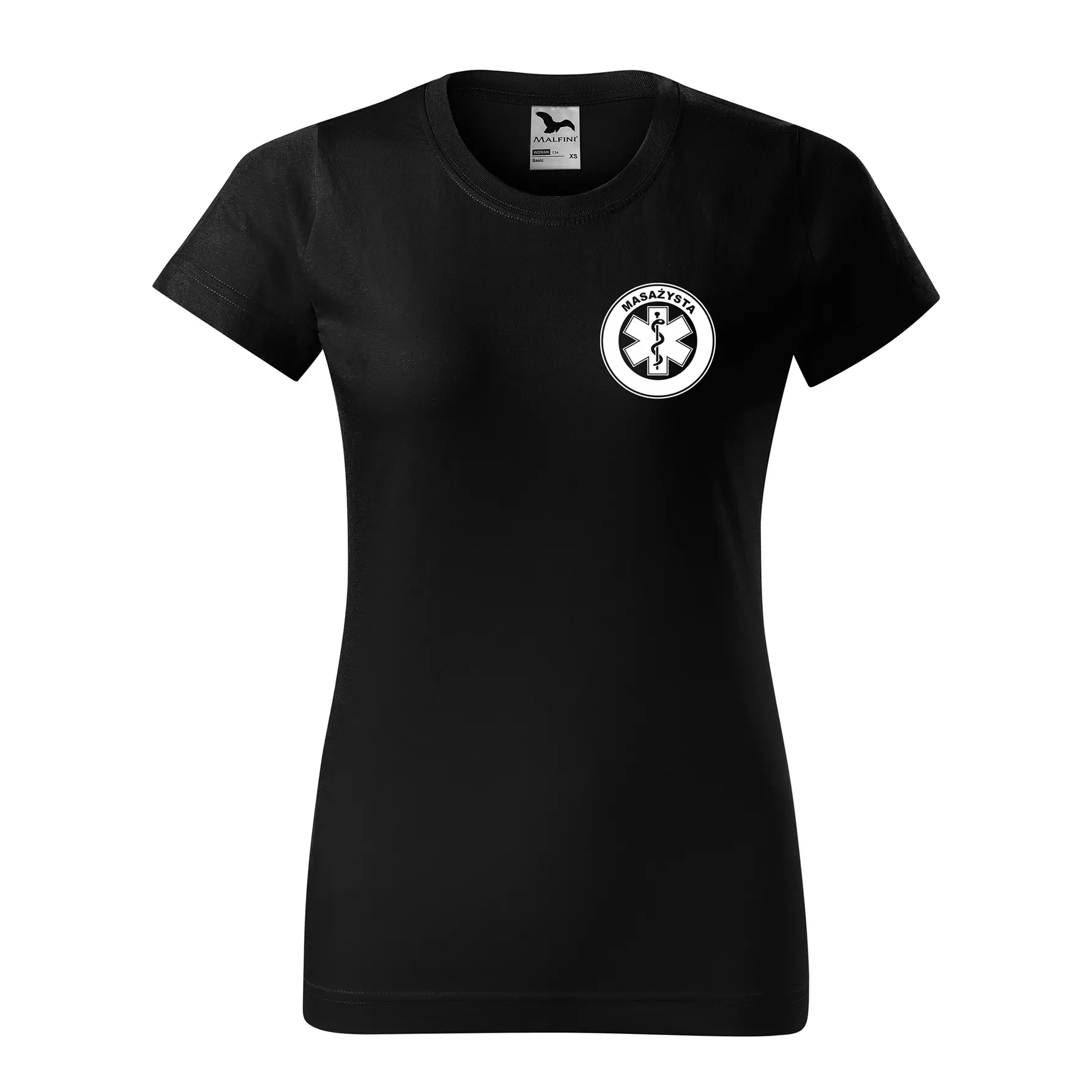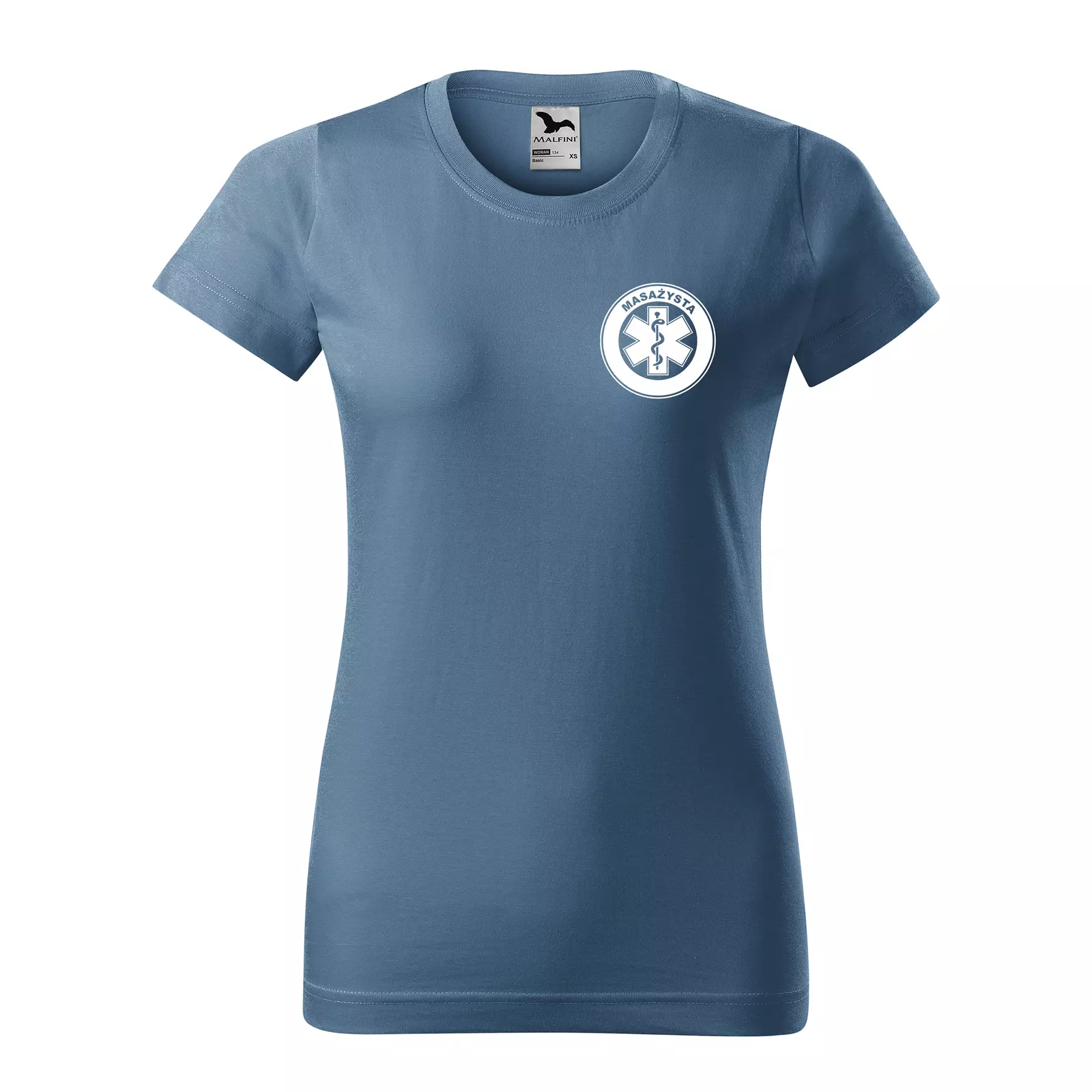 Koszulka damska BASIC 134 medyczna z krótkim rękawem z logo na sercu i plecach z nadrukiem MASAŻYSTA logo 160 g/m² koszulka krótki rękaw WSZYSTKIE KOLORY