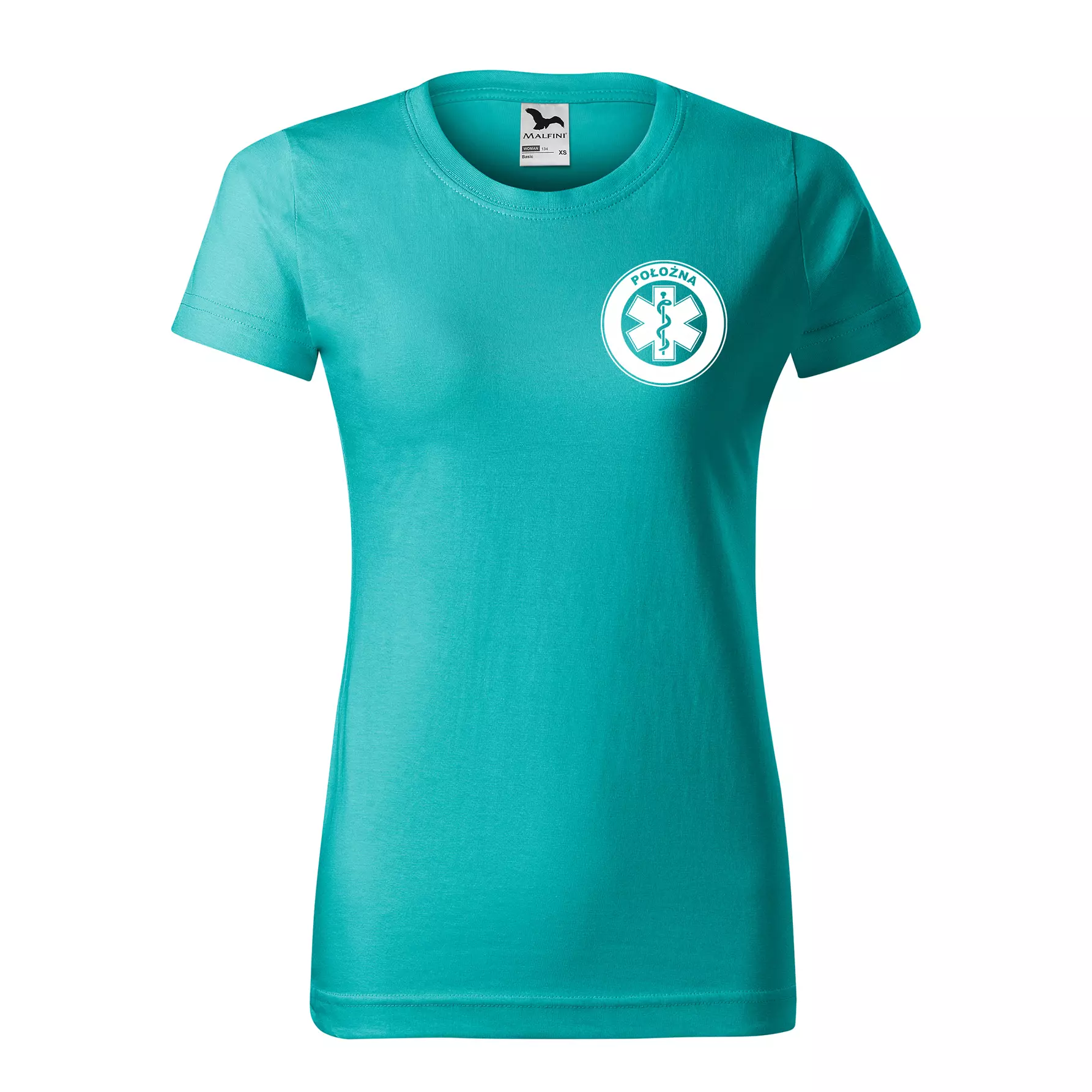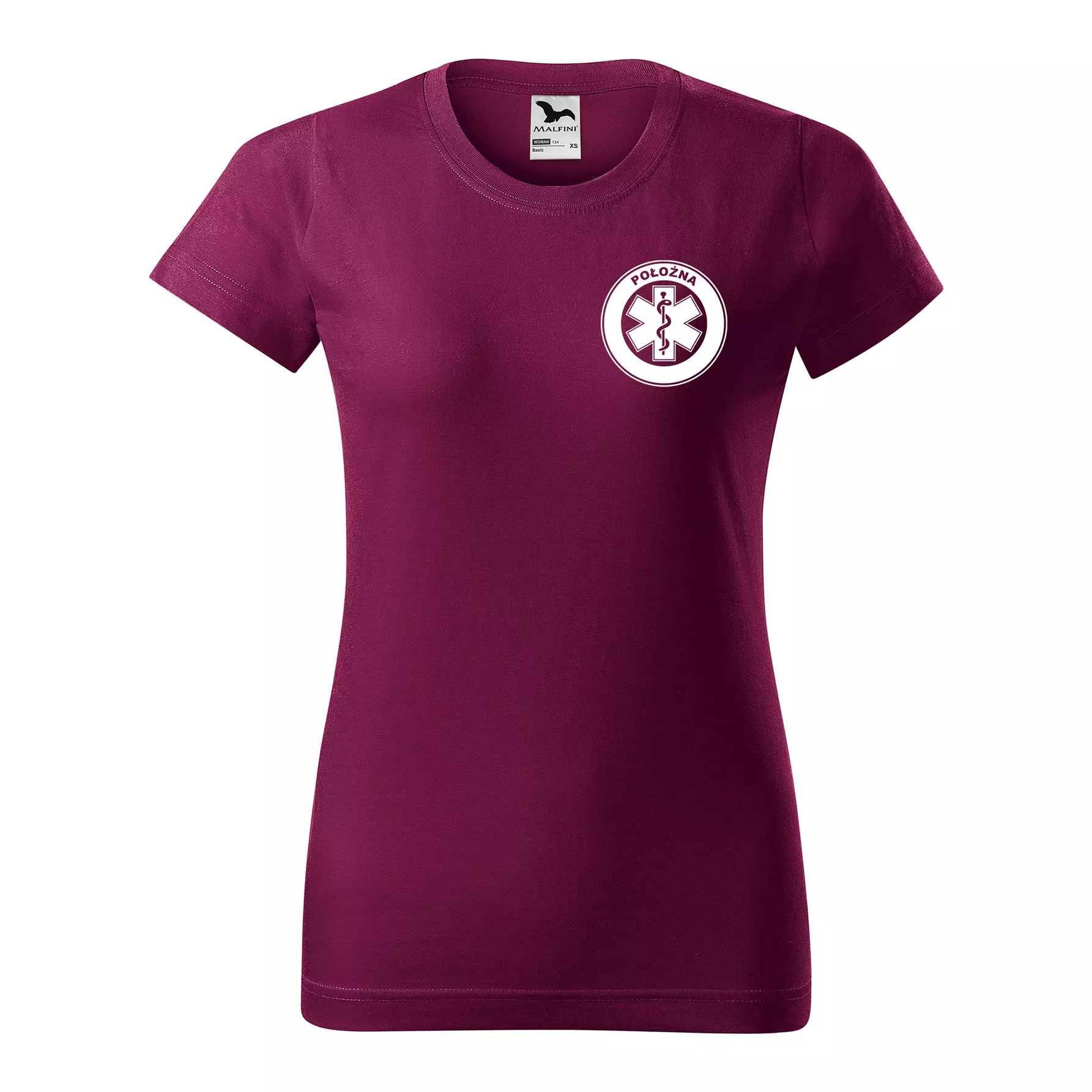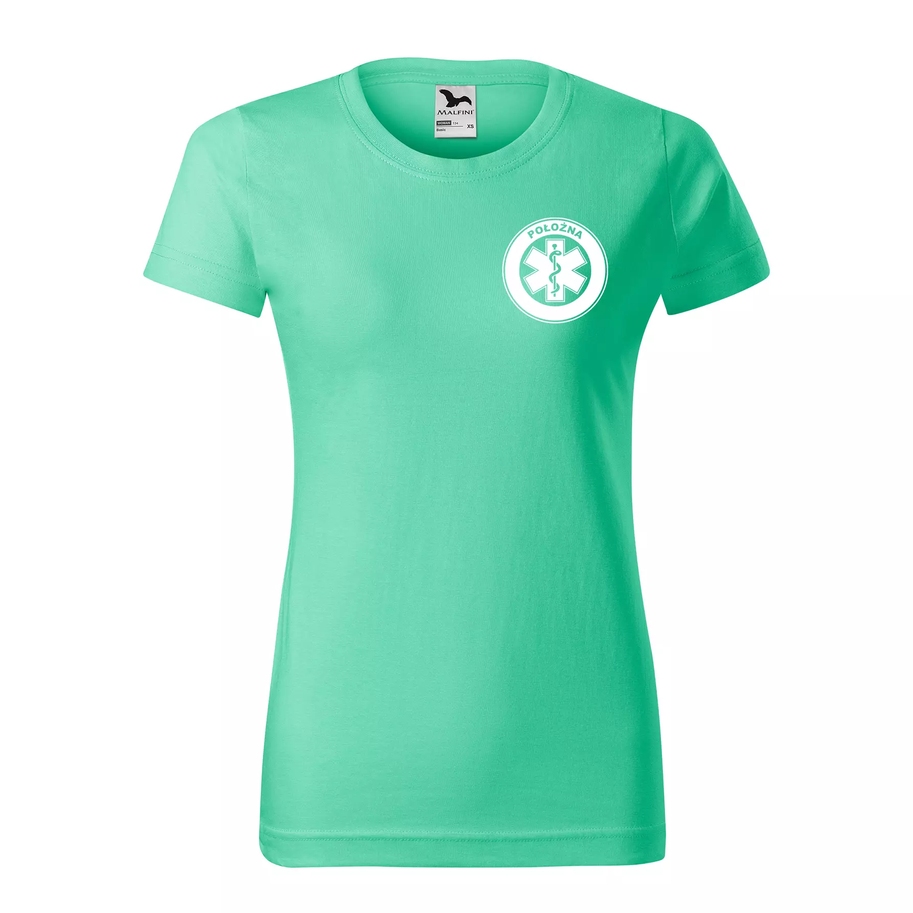 Koszulka damska BASIC 134 medyczna z krótkim rękawem z logo na sercu i plecach z nadrukiem POŁOŻNA logo 160 g/m² koszulka krótki rękaw WSZYSTKIE KOLORY
