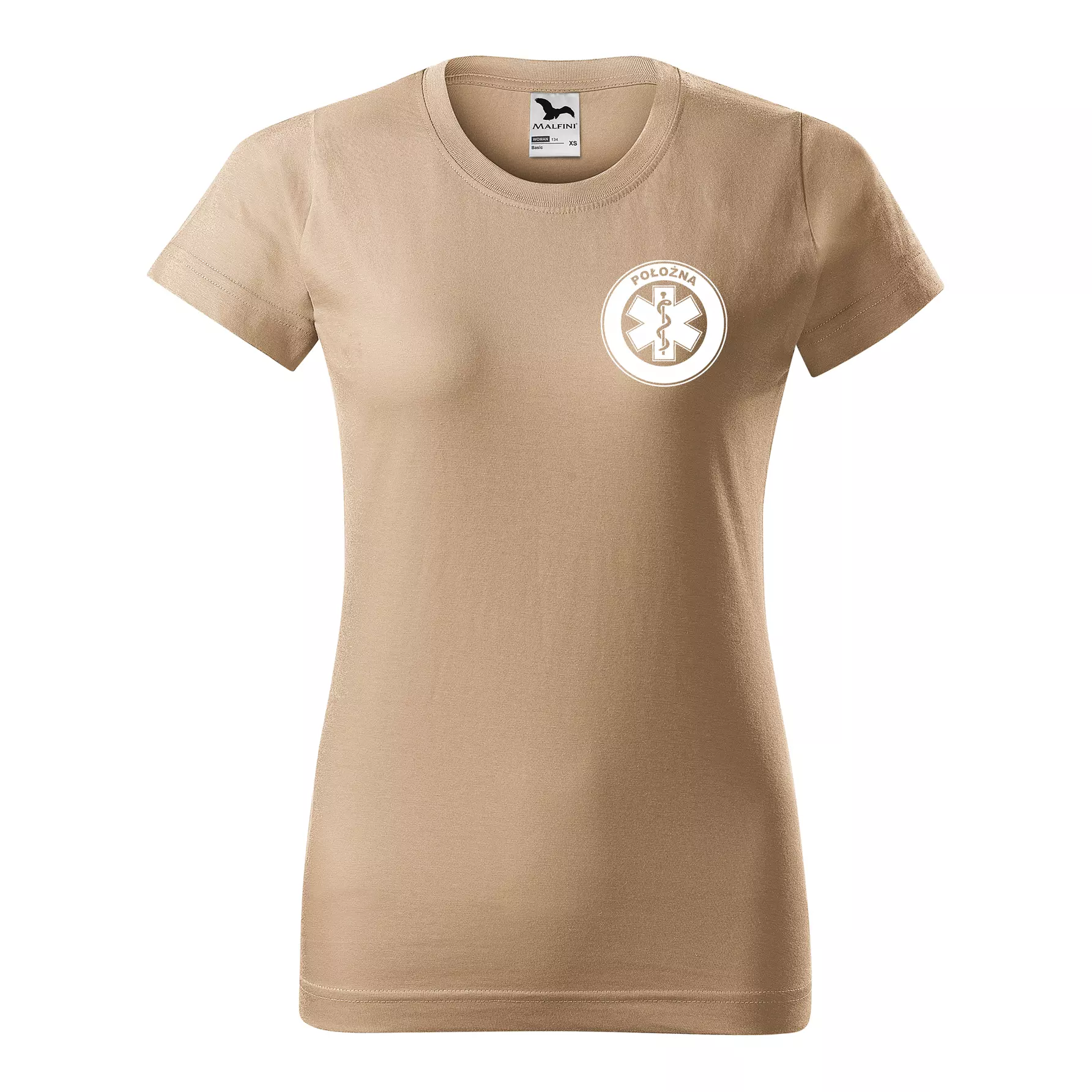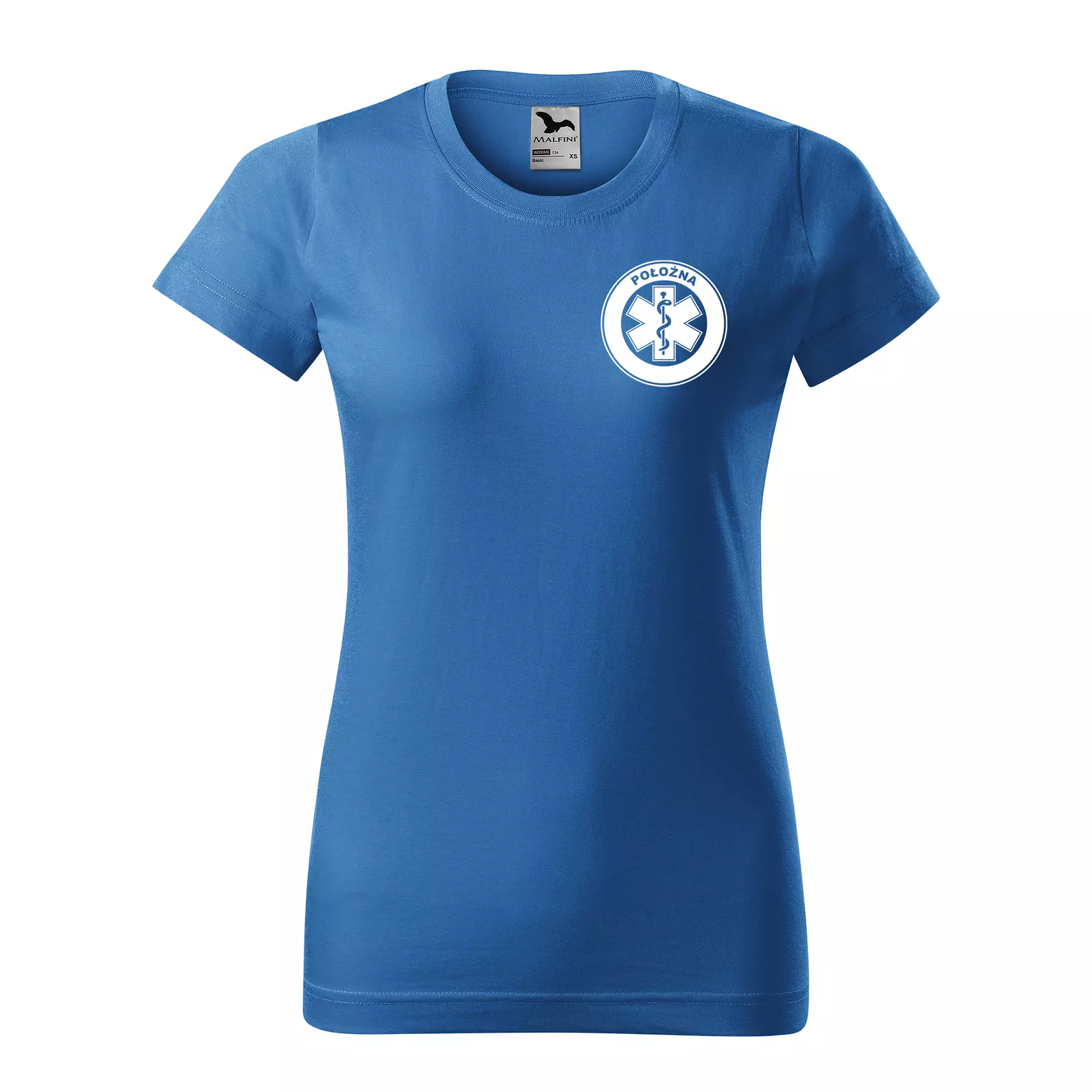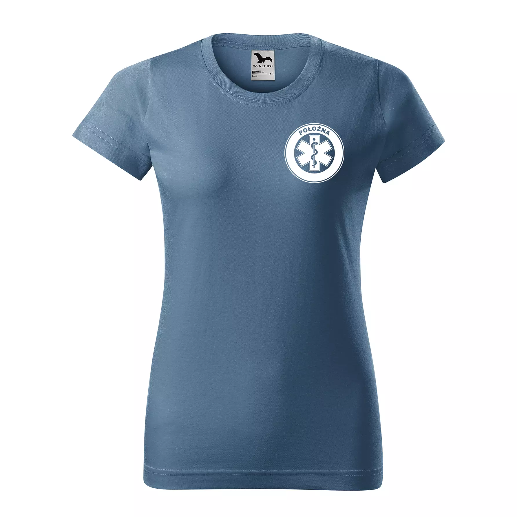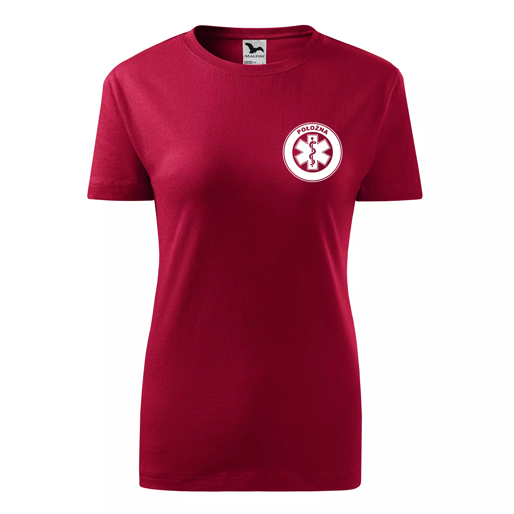Koszulka damska BASIC 134 medyczna z krótkim rękawem z logo na sercu i plecach z nadrukiem POŁOŻNA logo 160 g/m² koszulka krótki rękaw WSZYSTKIE KOLORY