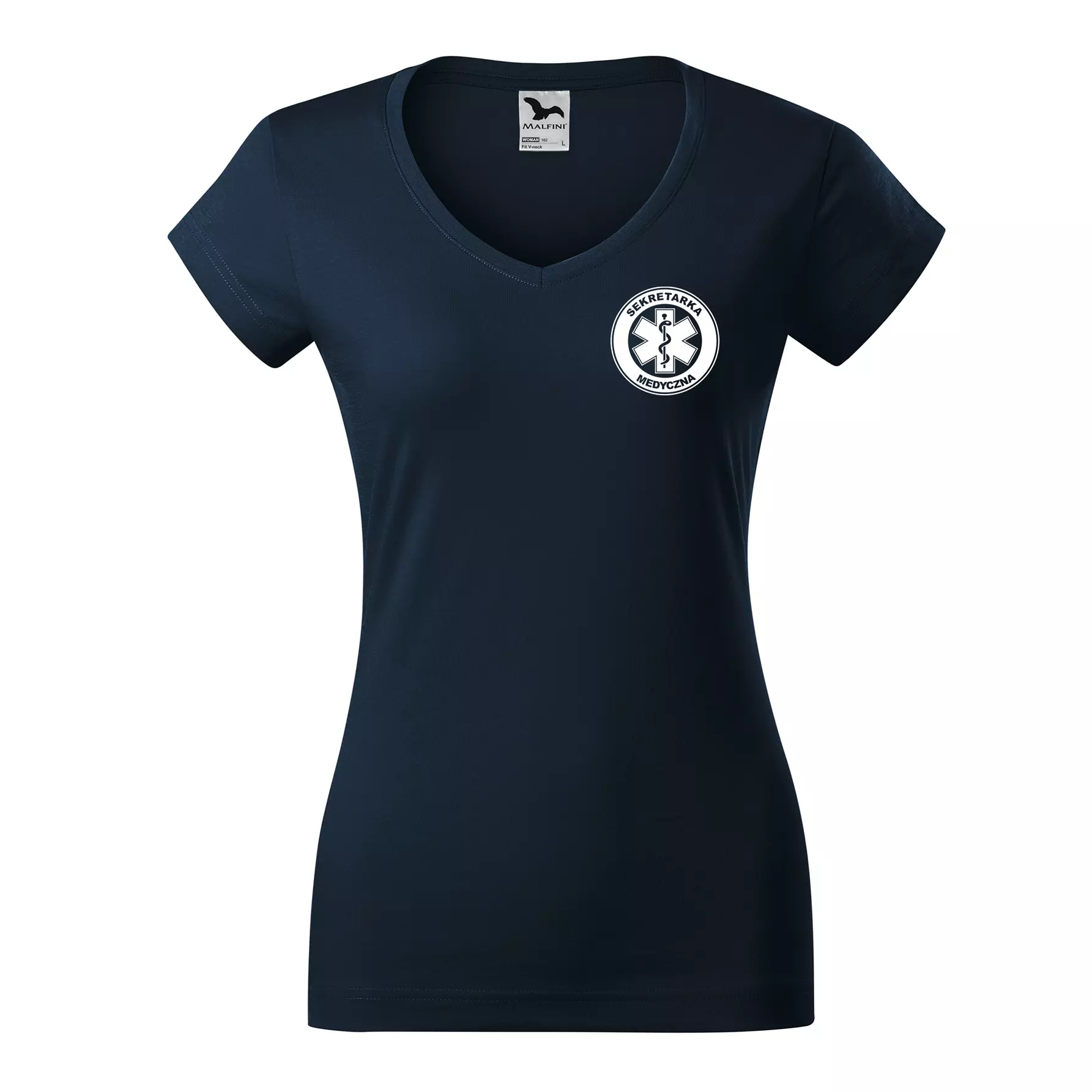 Koszulka damska Fit V-neck 162 medyczna z krótkim rękawem z logo na sercu i plecach z nadrukiem SEKRETARKA MEDYCZNA logo 180 g/m² koszulka krótki rękaw WSZYSTKIE KOLORY