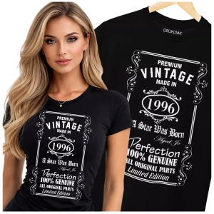 Koszulka damska dla kobiety na 30 trzydzieste urodziny z nadrukiem "PREMIUM VINTAGE MADE IN 1996 A STAR WAS BORN AGED TO PERFECTION 100% GENUINE ALL ORIGINAL PARTS LIMITED EDITION"