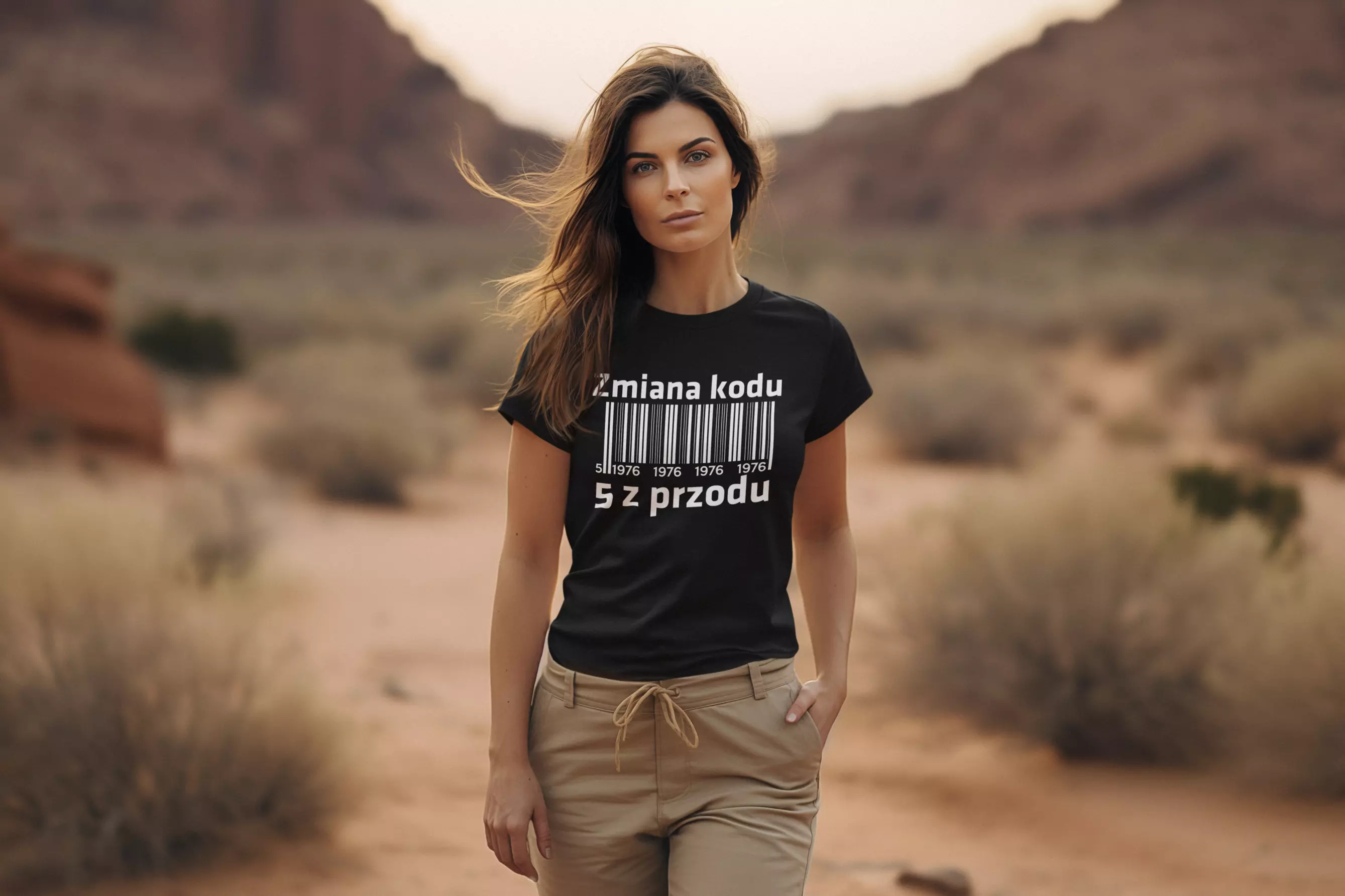 Koszulka damska dla kobiety na 50 urodziny z napisem: "ZMIANA KODU 5 Z PRZODU 1976"