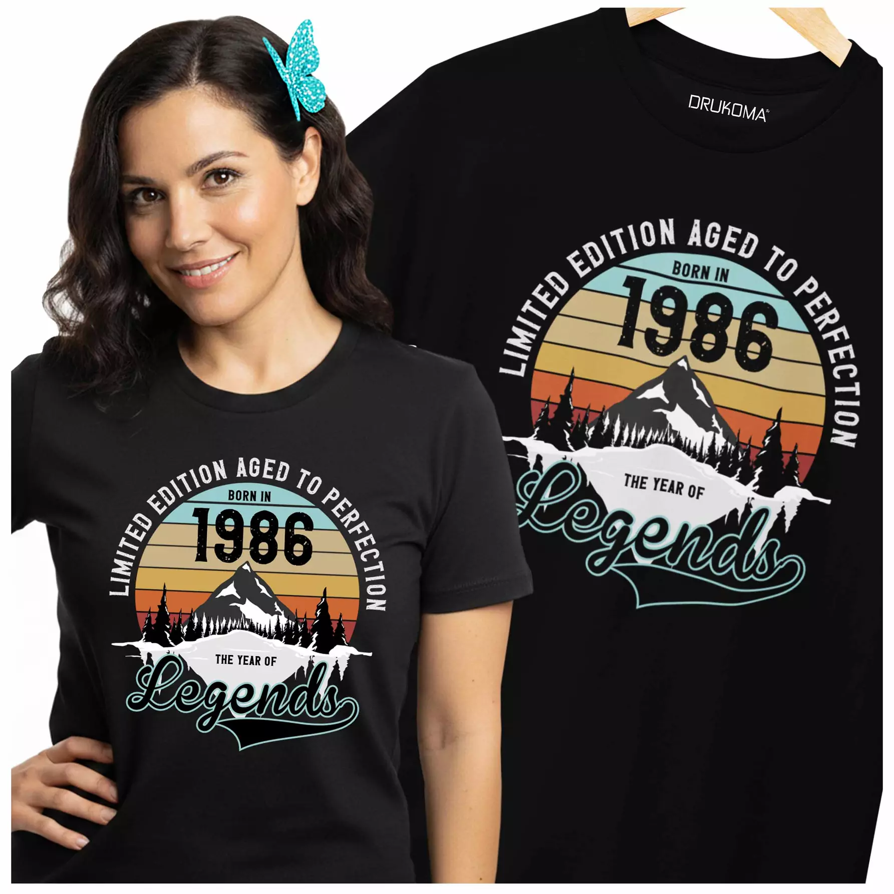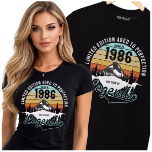Koszulka damska na 40 urodziny na czterdziestkę z napisem: "LIMITED EDITION AGED TO PERFECTION BORN IN 1986 THE YEAR OF LEGENDS"