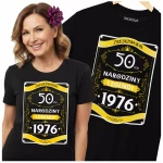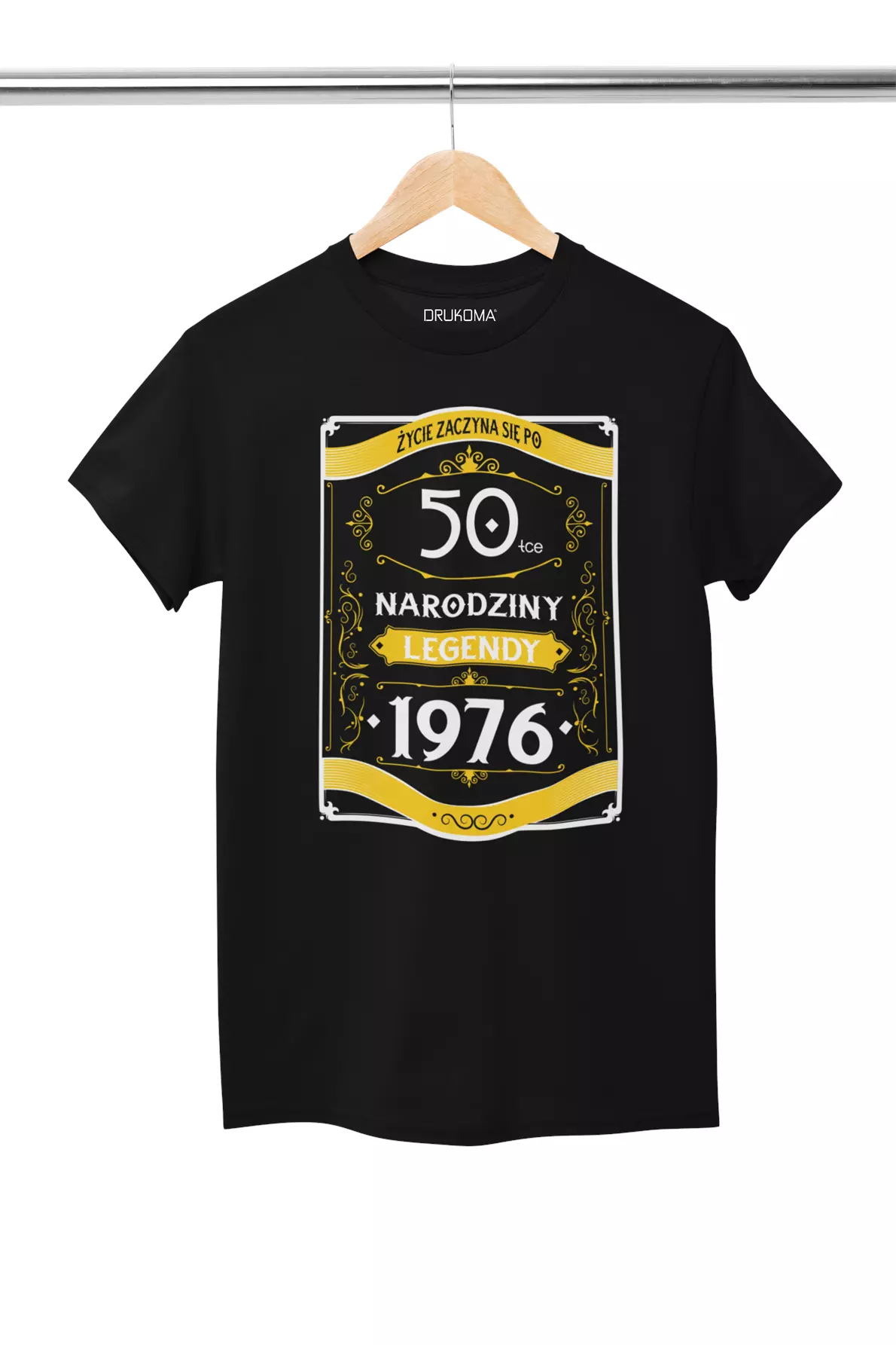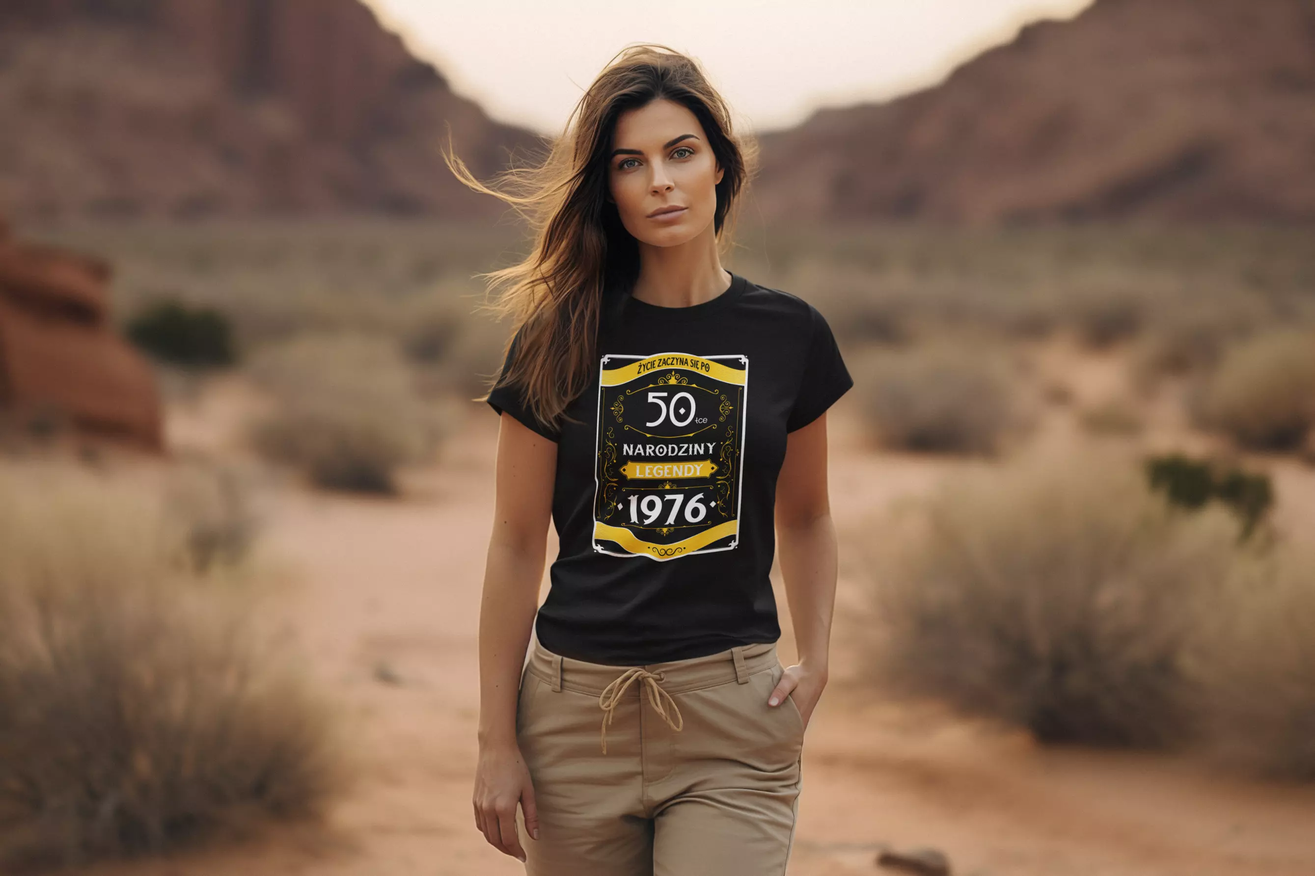 Koszulka damska na 50 urodziny na pięćdziesiątkę z napisem: "50 LAT ŻYCIE ZACZYNA SIĘ PO 50-TCE NARODZINY LEGENDY 1976"