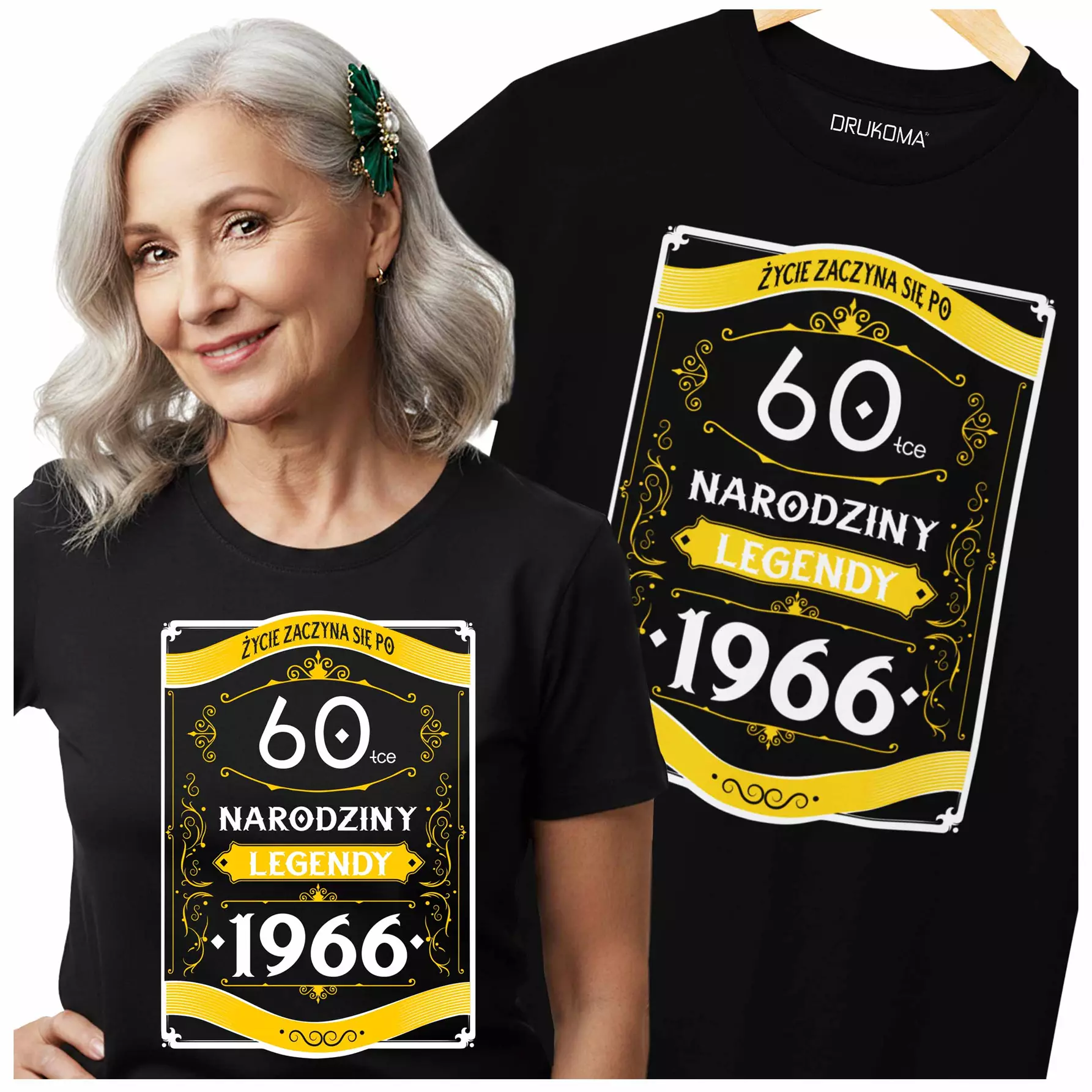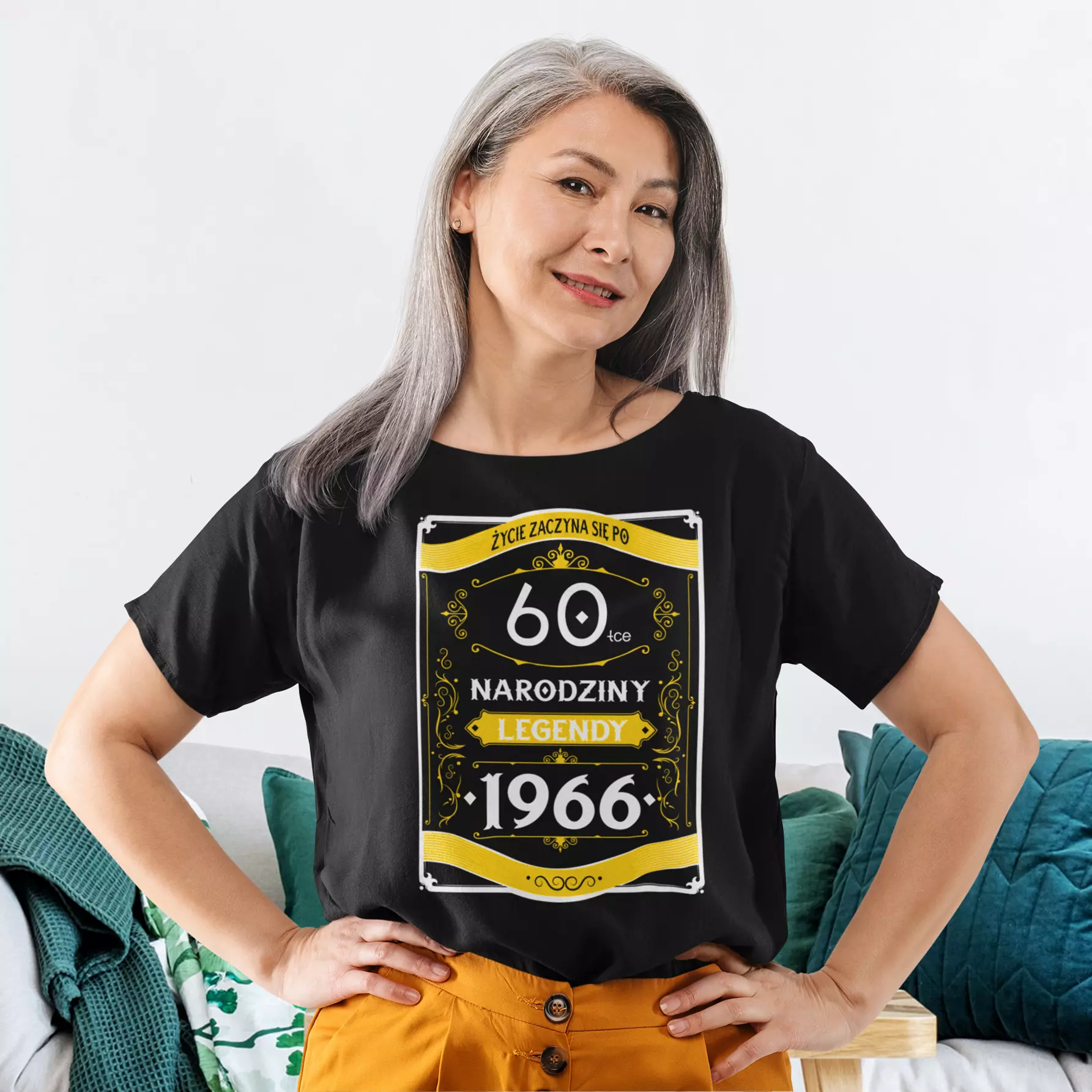 Koszulka damska na 60 urodziny na sześćdziesiątkę z napisem: "60 LAT ŻYCIE ZACZYNA SIĘ PO 60-TCE NARODZINY LEGENDY 1966"