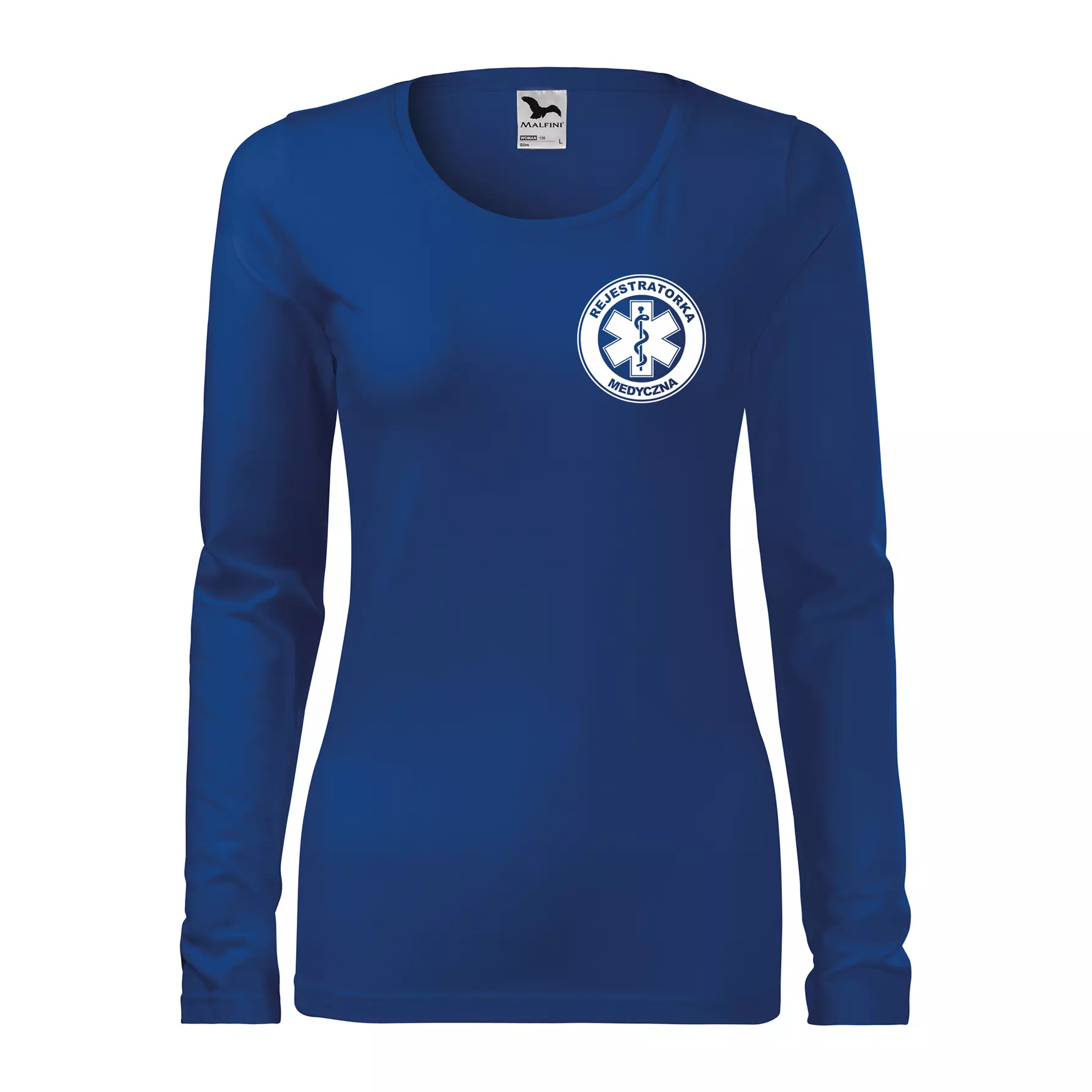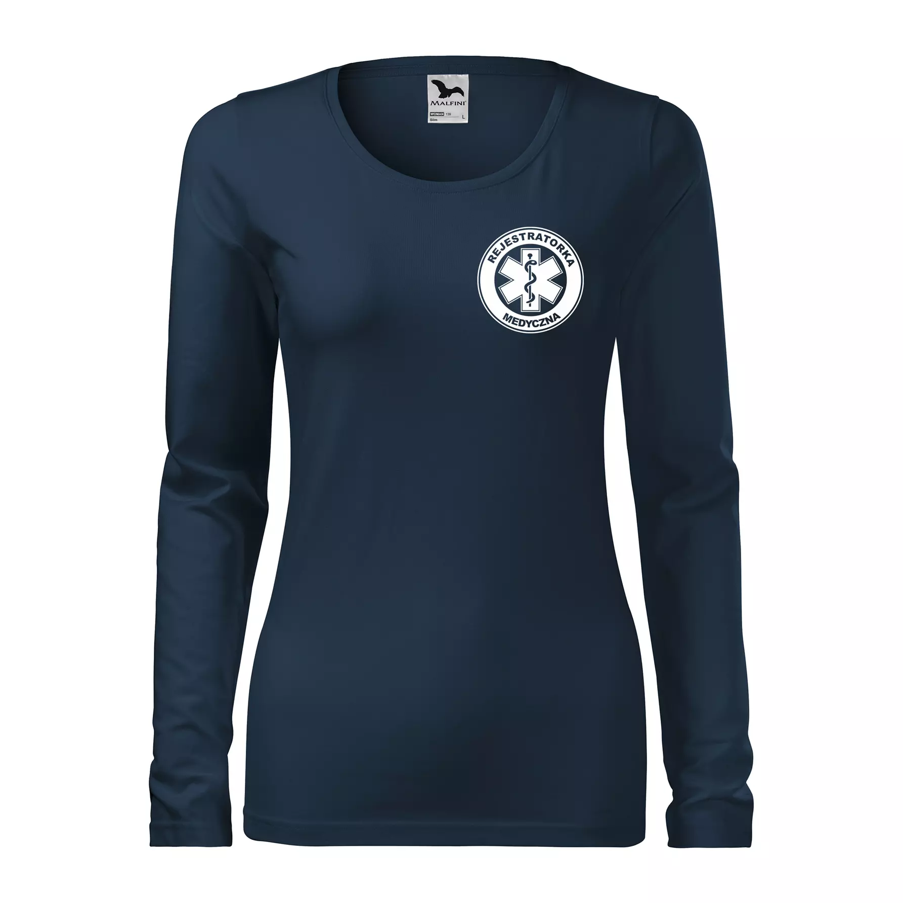 Koszulka damska z długim rękawem Slim 139 z logo własnym nadrukiem REJESTRATORKA MEDYCZNA na sercu i plecach odzież reklamowa 180 g/m² WSZYSTKIE KOLORY