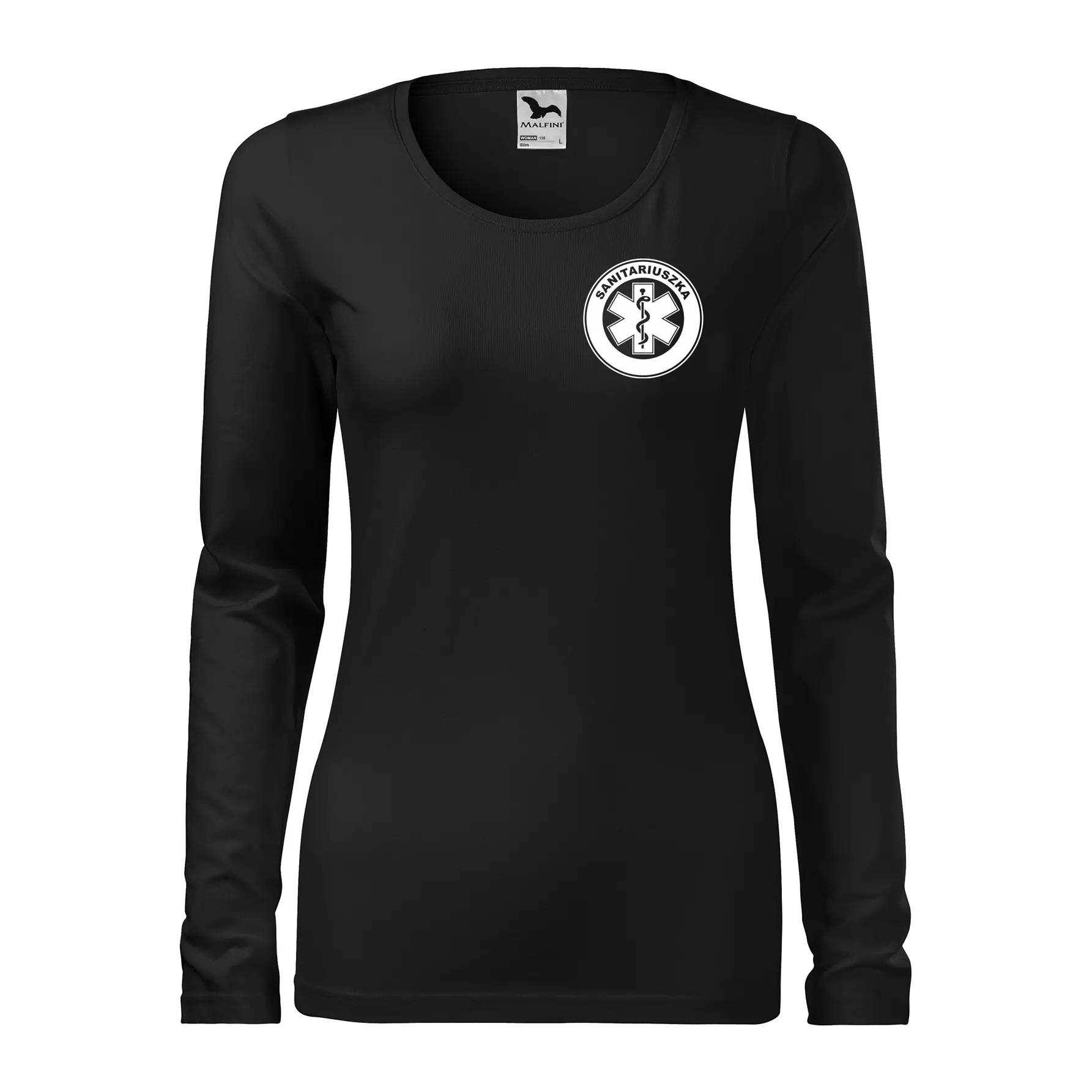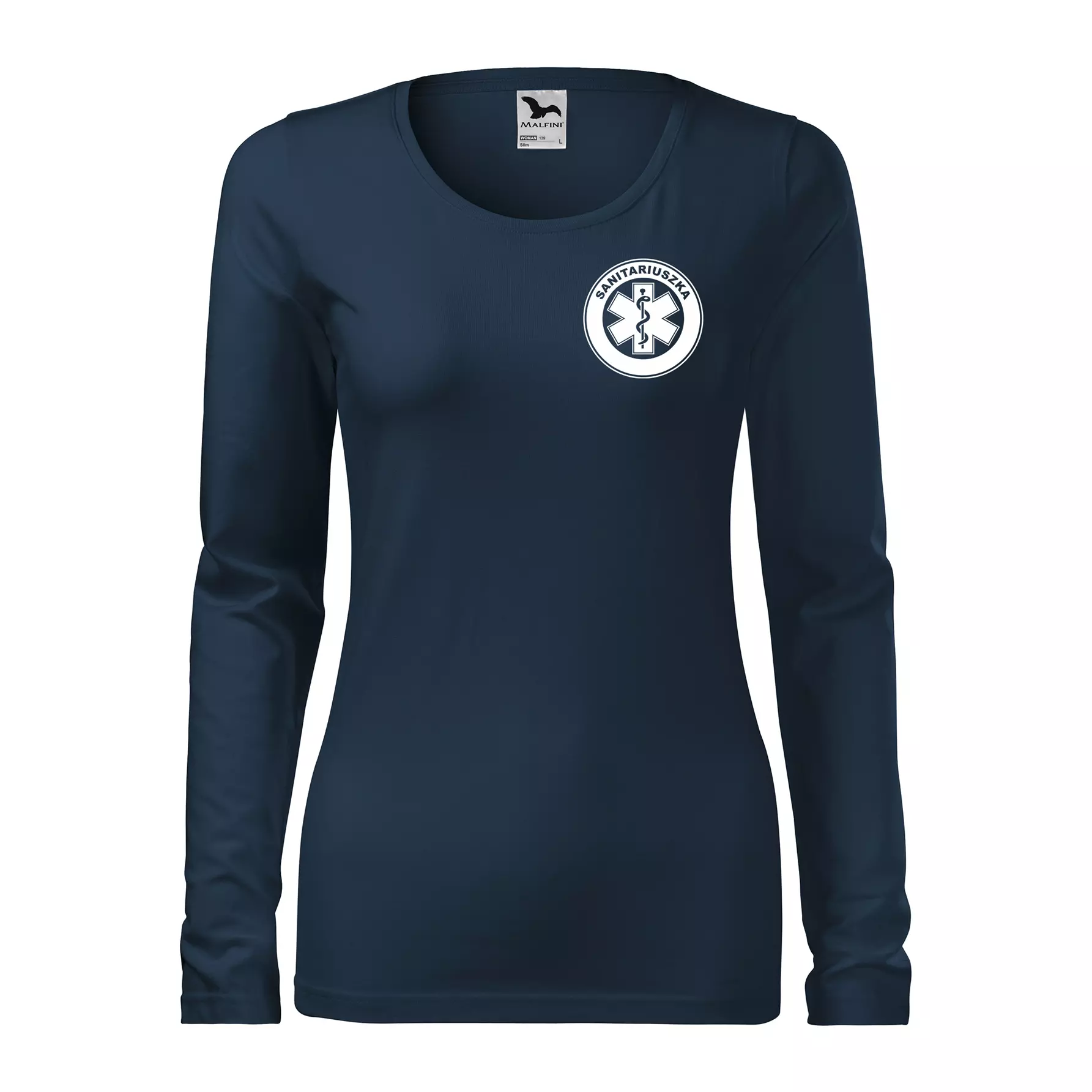 Koszulka damska z długim rękawem Slim 139 z logo własnym nadrukiem SANITARIUSZKA na sercu i plecach odzież reklamowa 180 g/m² WSZYSTKIE KOLORY