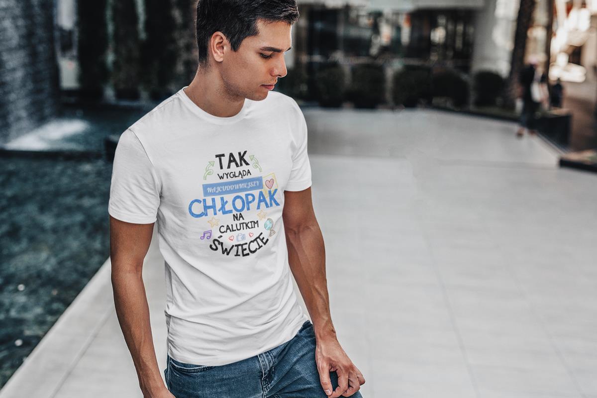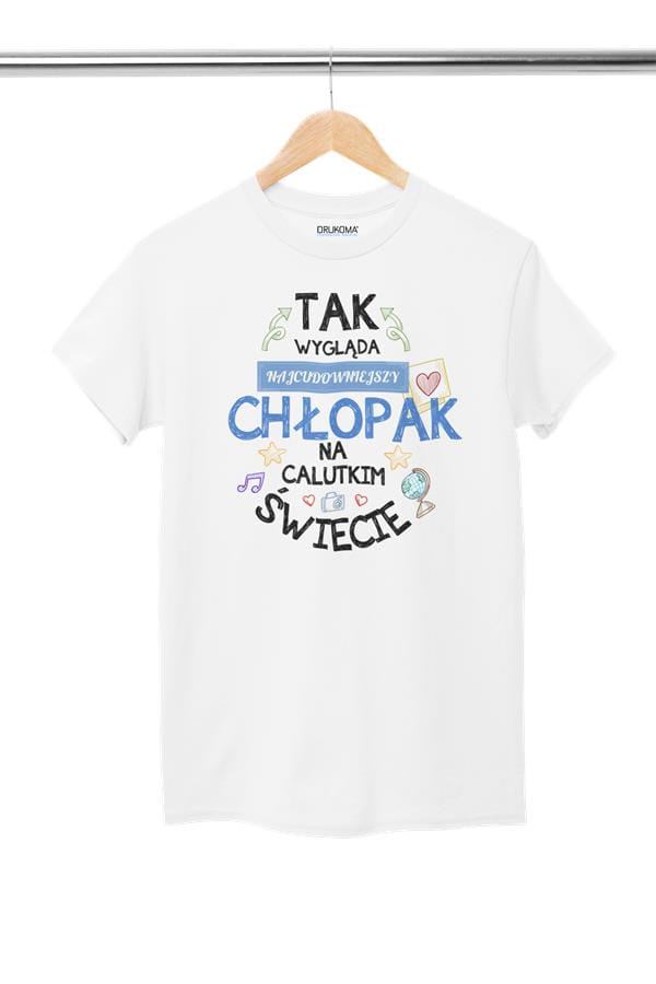 Koszulka dla Chłopaka modny prezent na Walentynki lub Urodziny stylowa koszulka z napisem "Tak wygląda najcudowniejszy chłopak na calutkim świecie" w kolorze białym