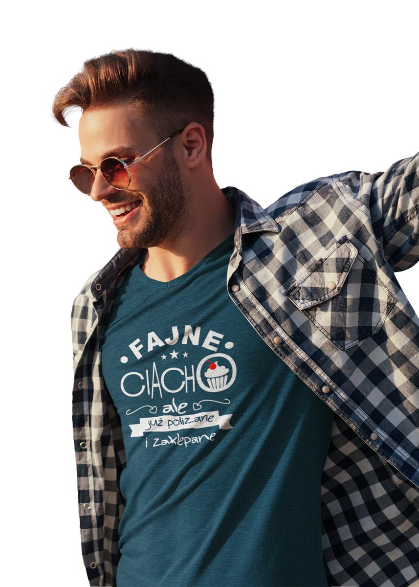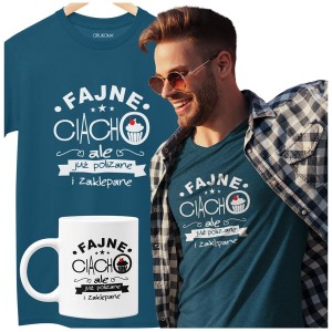 Koszulka dla Chłopaka w zestawie z kubkiem z nadrukiem FAJNE CIACHO, ALE JUŻ POLIZANE I ZAKLEPANE KOLOR PETROL BLUE