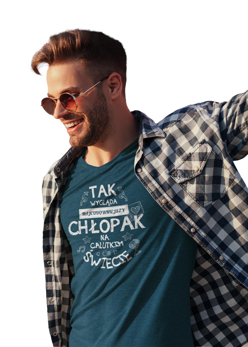 Koszulka dla Chłopaka w zestawie z kubkiem z nadrukiem "Tak wygląda najcudowniejszy Chłopak na calutkim świecie" w kolorze petrol blue