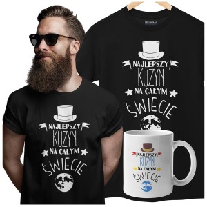 Koszulka dla Kuzyna w zestawie z kubkiem z nadrukiem "Najlepszy Kuzyn na całym świecie" w kolorze czarnym