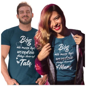 Koszulka dla Mamy i Taty na Dzień Mamy i Taty z napisem Bóg nie może być wszędzie dlatego stworzył Mamę oraz Bóg nie może być wszędzie dlatego stworzył Tatę w kolorze petrol blue