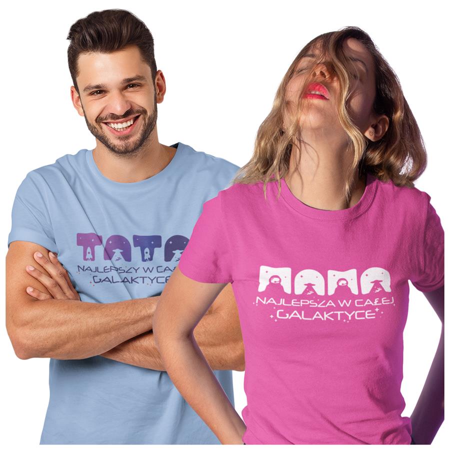 Koszulki z napisem "Mama najlepsza w całej galaktyce" i "Tata najlepszy w całej galaktyce".