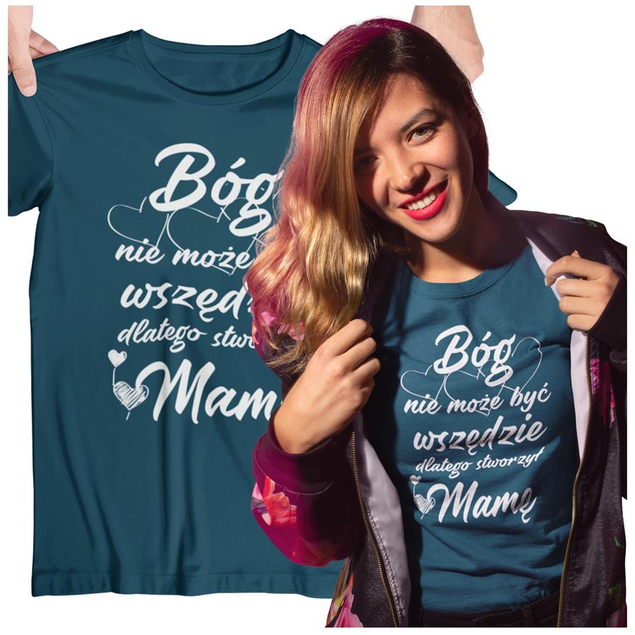 Koszulka dla Mamy na Dzień Mamy prezent Bóg nie może być wszędzie, dlatego stworzył MAMĘ koszulka petrol blue
