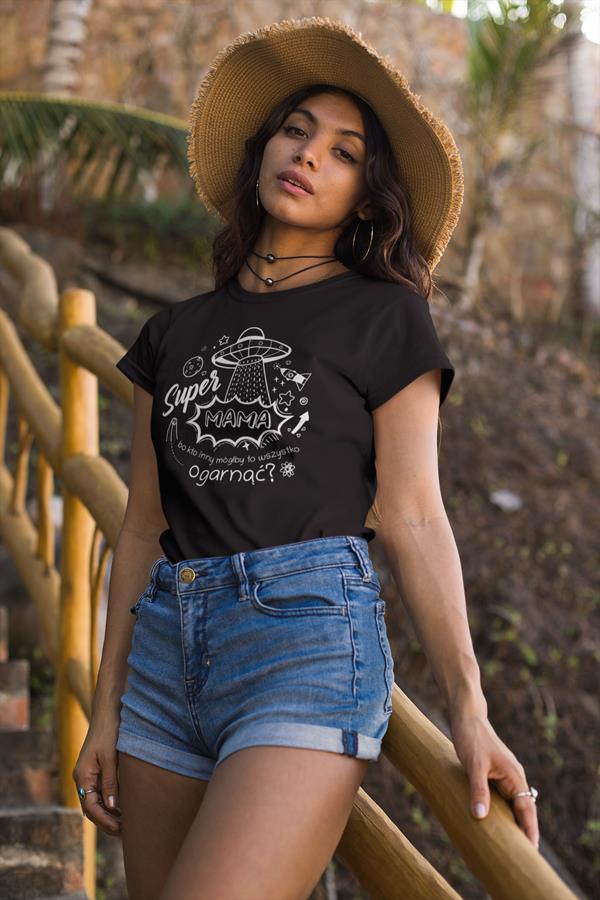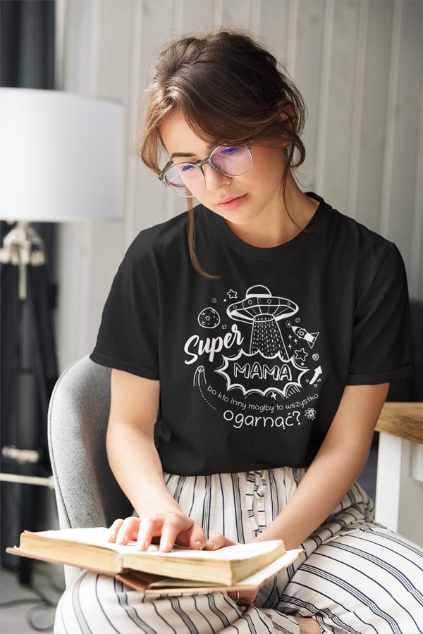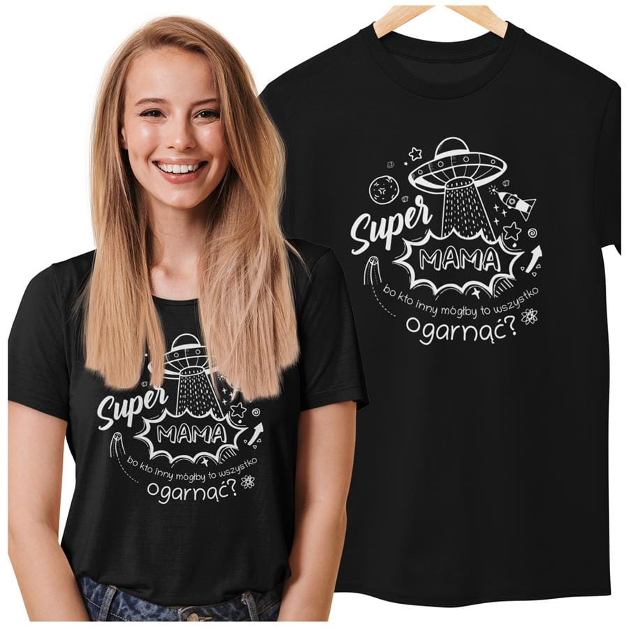 Koszulka dla Mamy na Dzień Mamy prezent z napisem "Super Mama, bo kto inny mógłby to ogarnąć?" kolor czarny